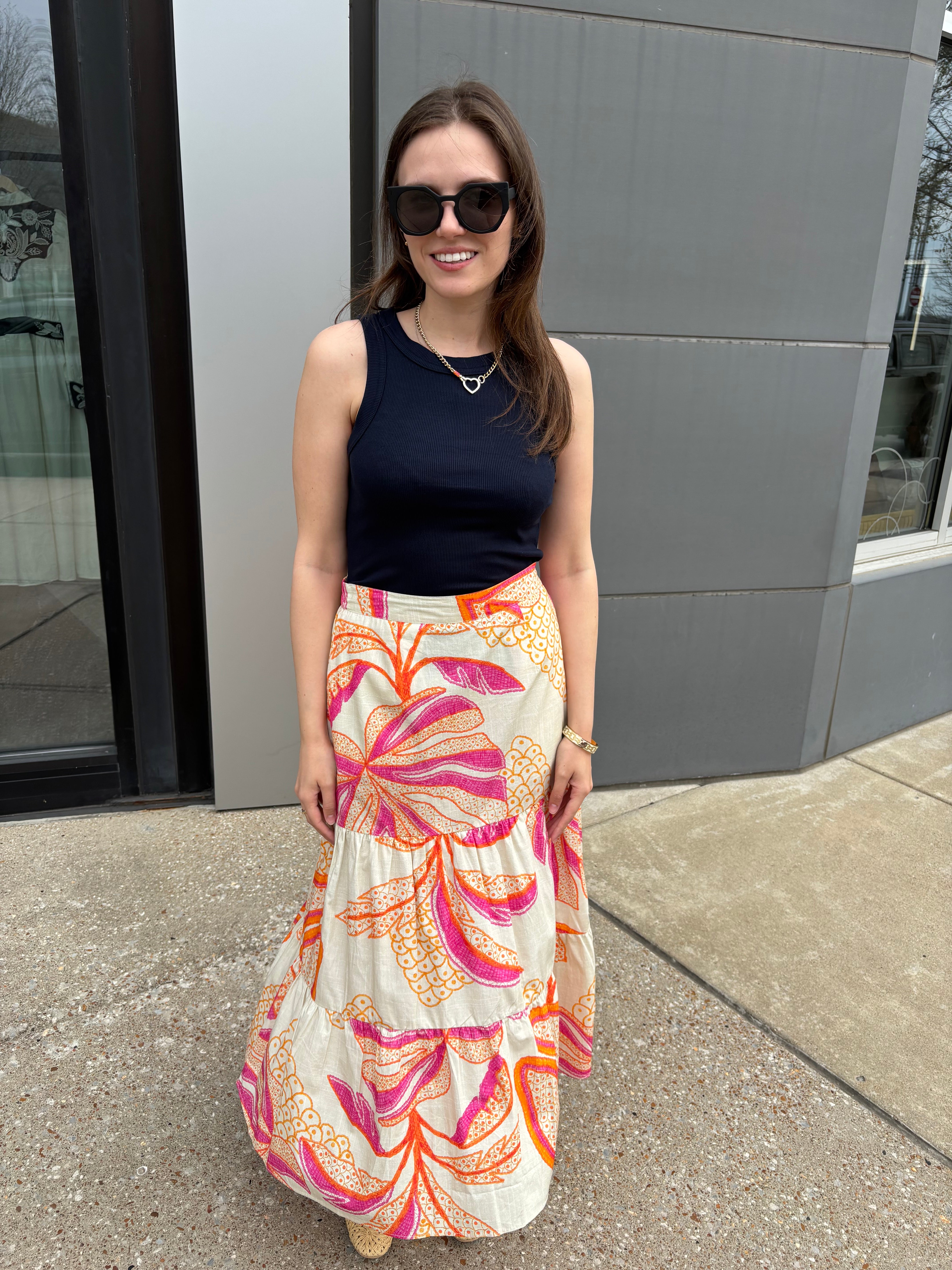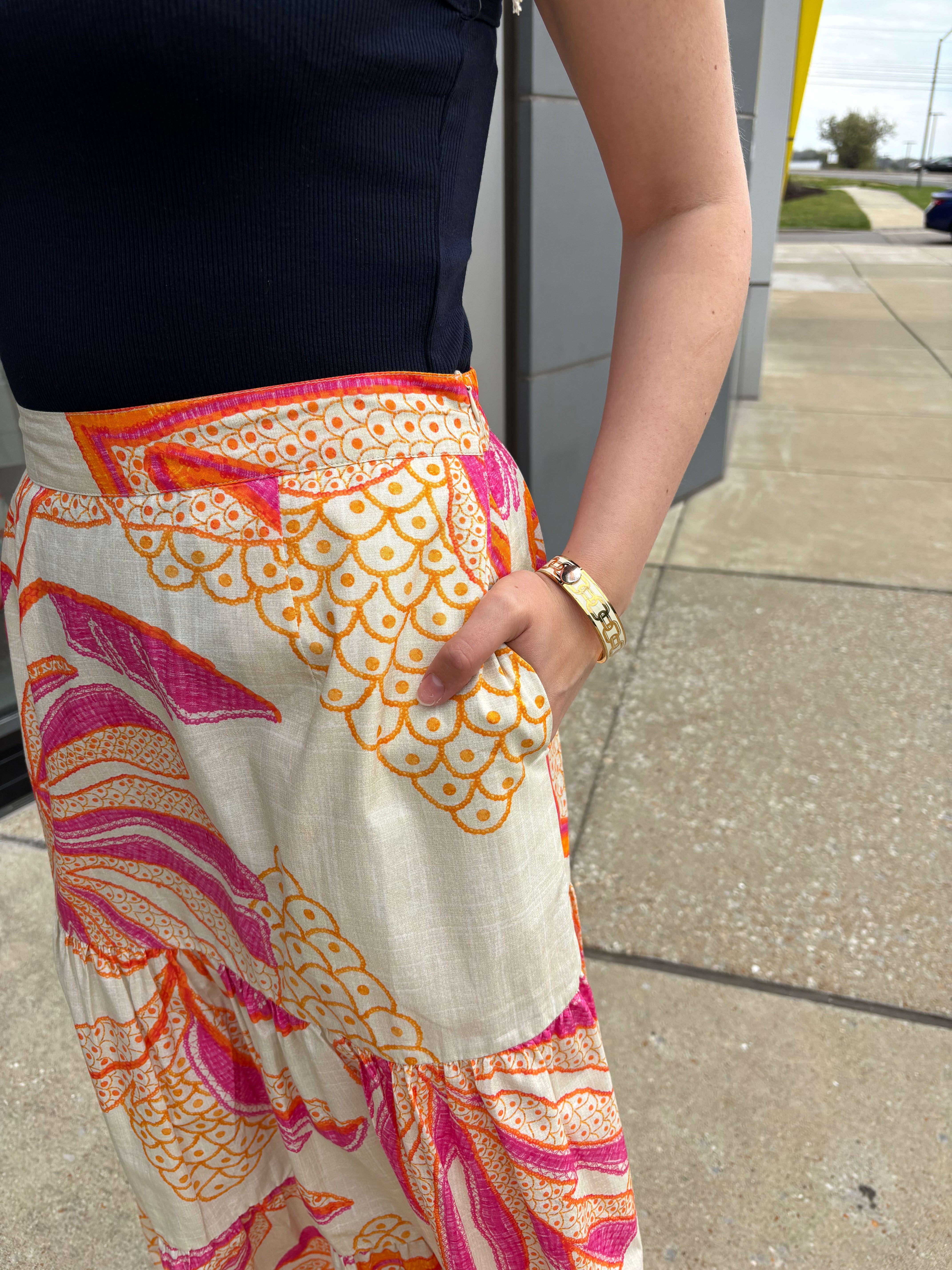 This new skirt is perfect for summer and pairs great with a basic tank! Pockets are always a plus! Find our Skyla Dress in the same print!