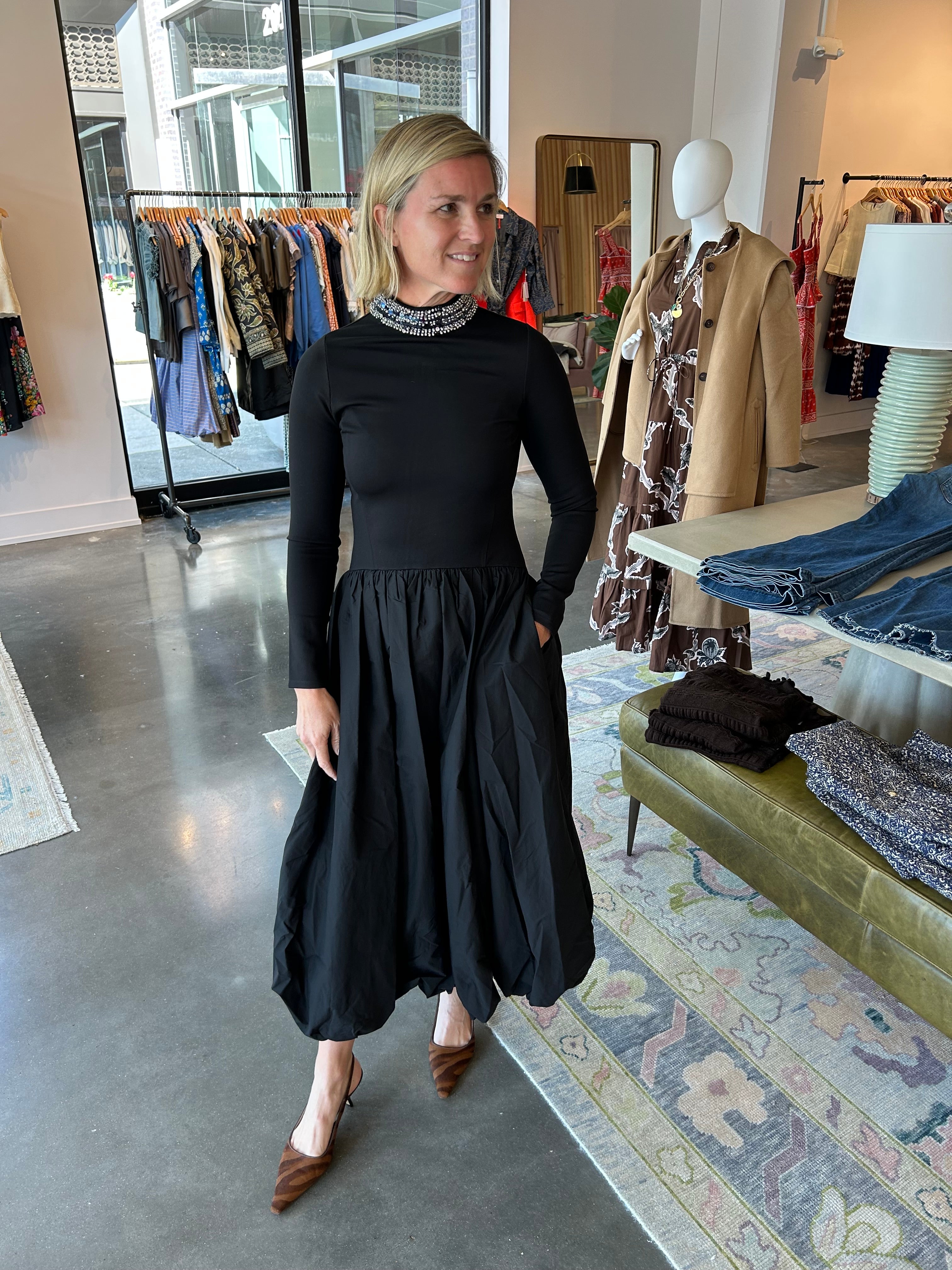 Long sleeved fitted knit bodice, bubble hem skirt with a sequin detail neckline.