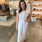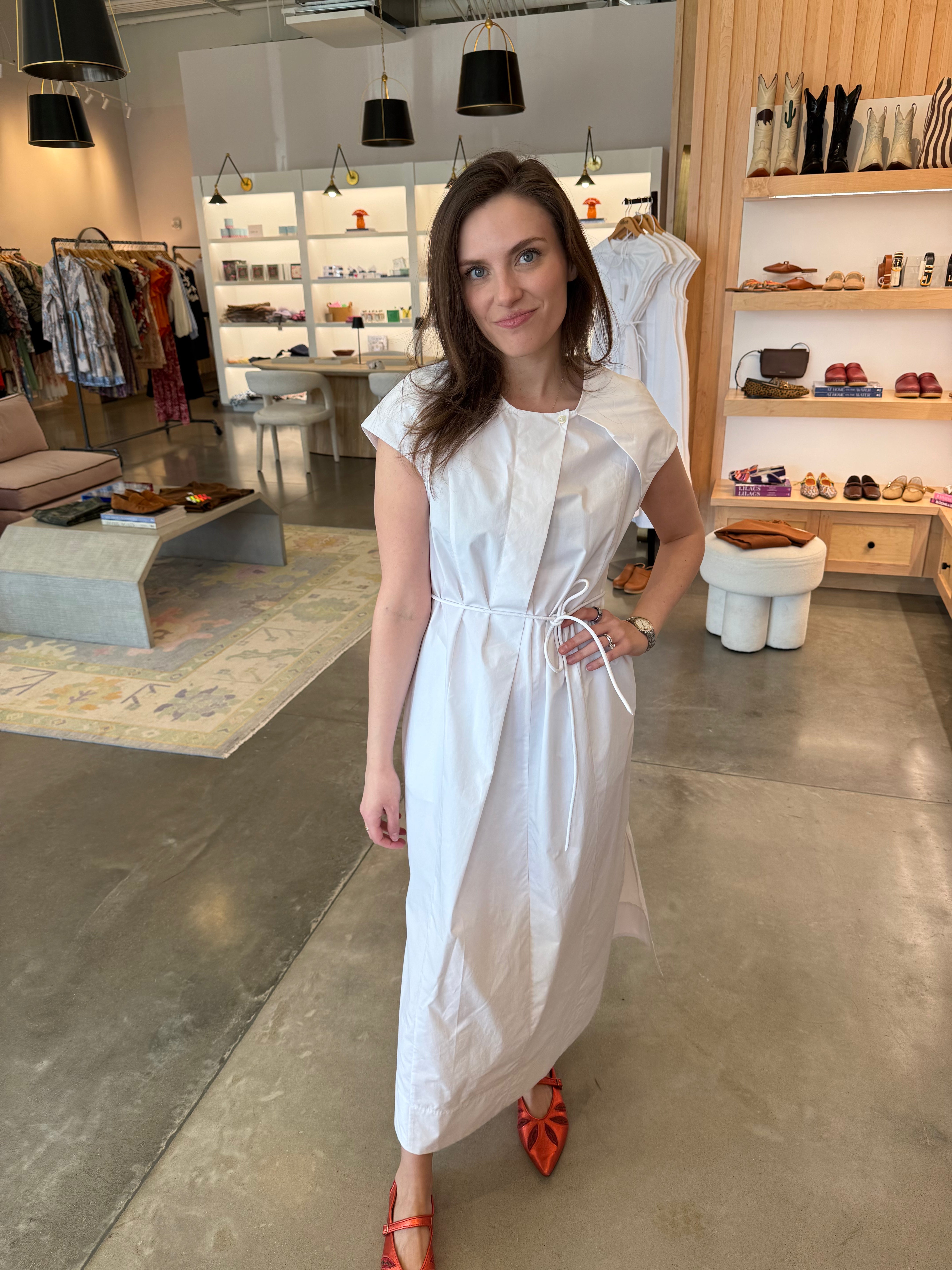Crafted in crisp organic cotton poplin, the Alma dress balances clean lines with thoughtful construction. Designed with extended shoulder raglan-style paneling, it features a split neckline fastened with a delicate button closure. A self-tie belt draws the waist in gently, while side seam pockets add everyday practicality to the fluid midi silhouette. Subtle in detail yet purposeful in design, it is a refined expression of modern dressing