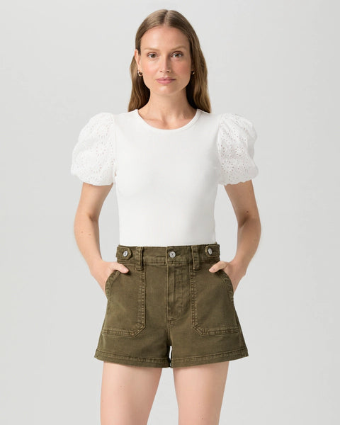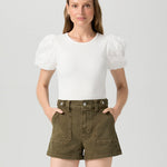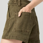 This effortlessly cool high-waisted short is crafted from super soft denim in a vintage-inspired olive green hue with waist tabs and utility pockets.