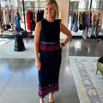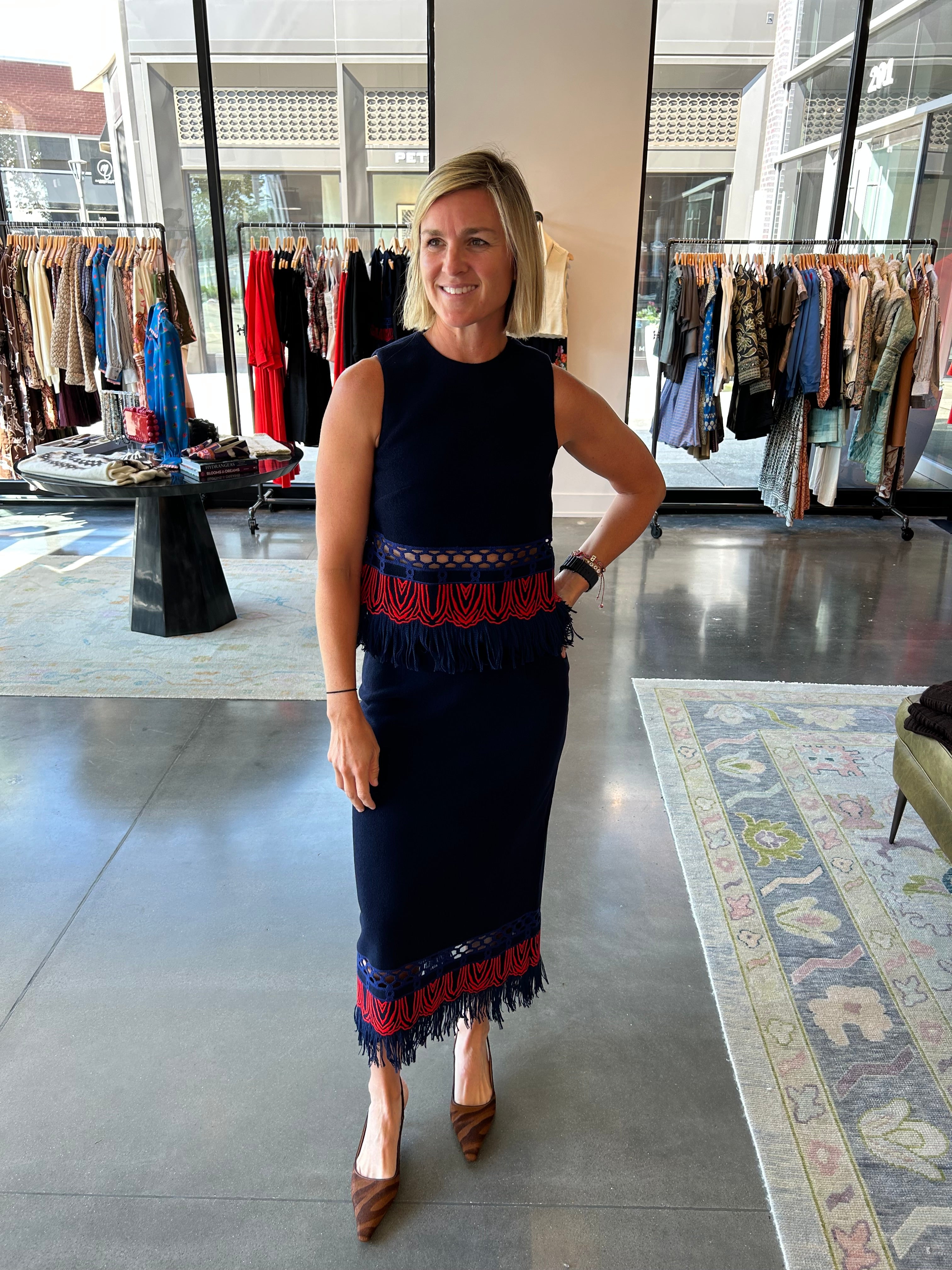 We love this sleeveless wool top. Pair it back with the matching skirt or throw it on with some navy pants or a jean. Fringe detail on hem of the top adds just the right amount of excitement.