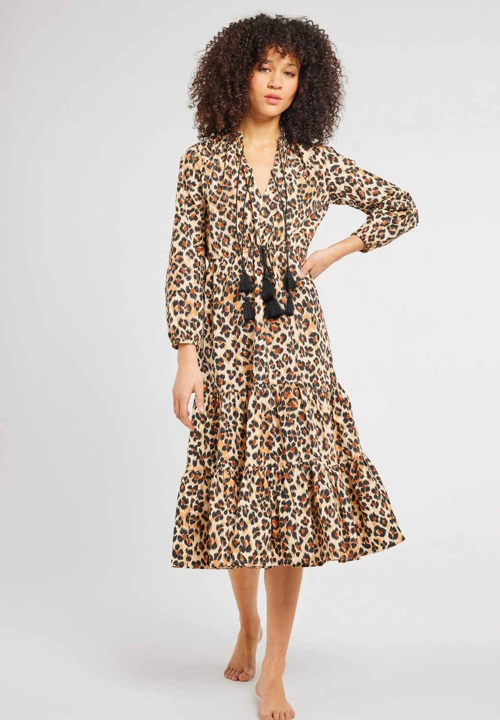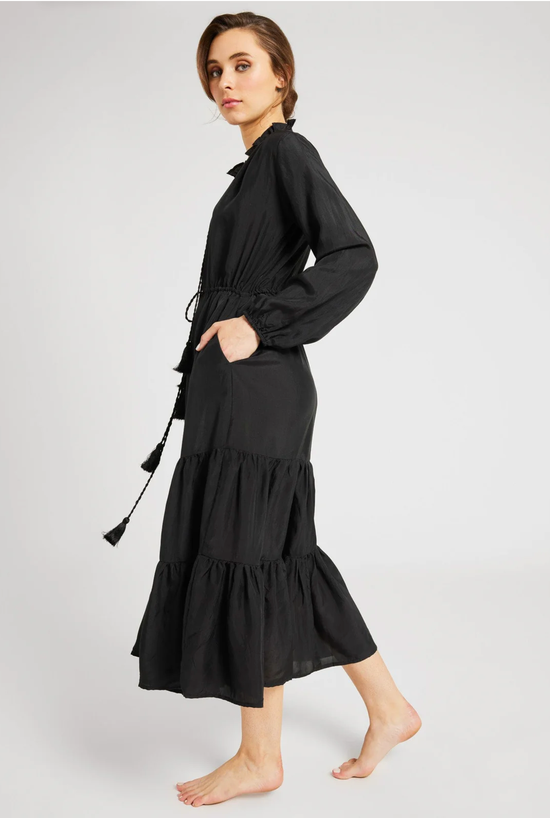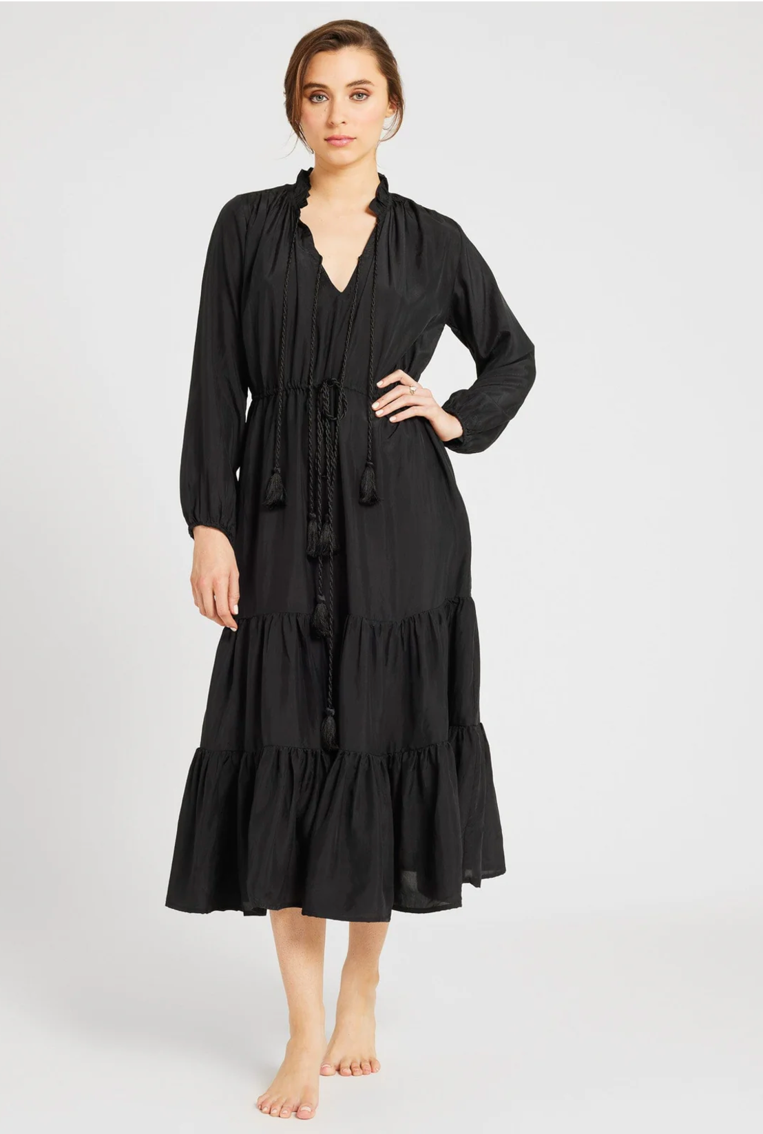 Astrid is a seasonless silhouette. Made with a drawstring waist, delicately ruffled neckline and a midi-length skirt, Astrid is sure to become your go-to dress through all seasons. Ties at waist with two additional ties at the necklace all finished with a sweet tassel detail. Pullover styling with elastic cuff and side pockets.