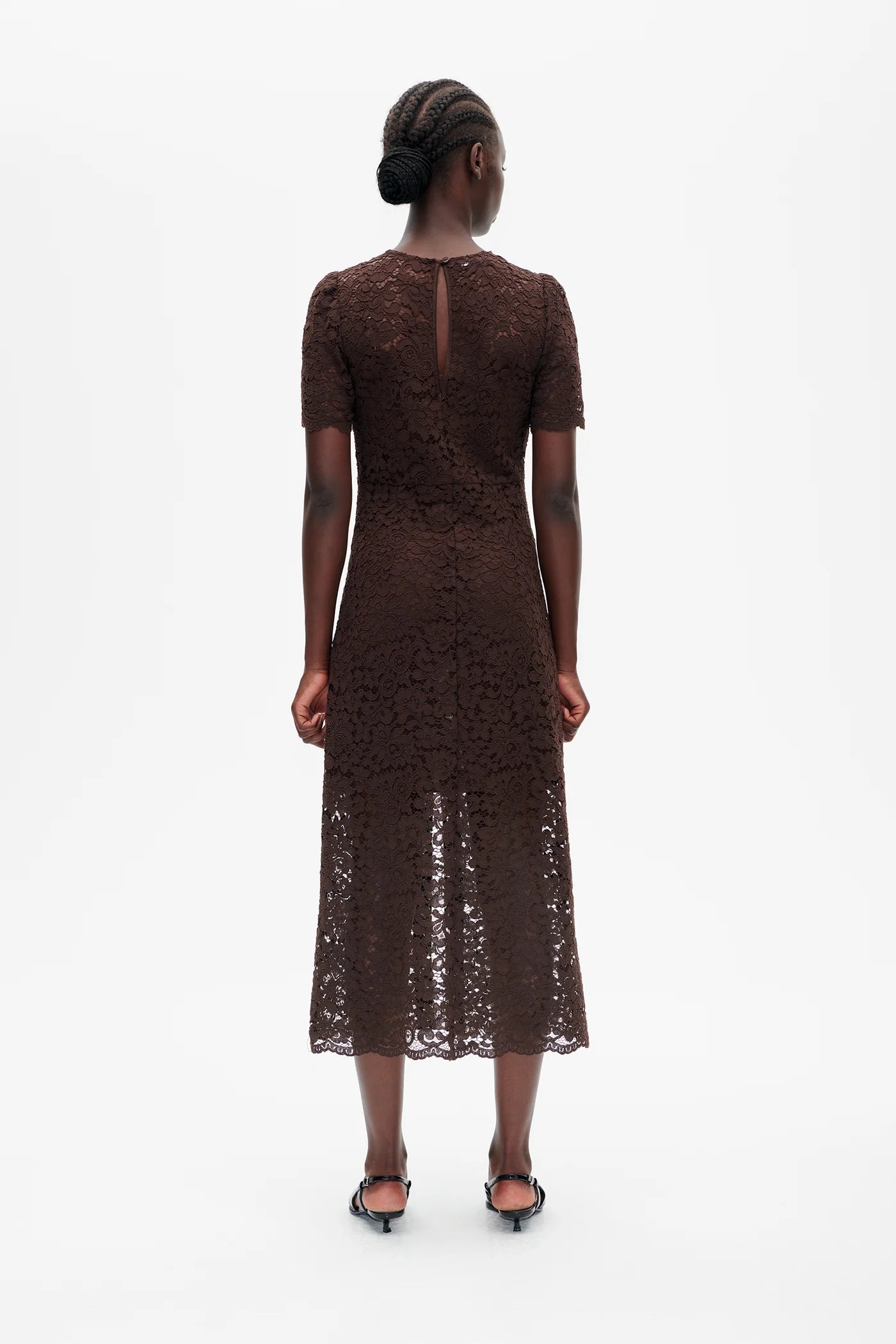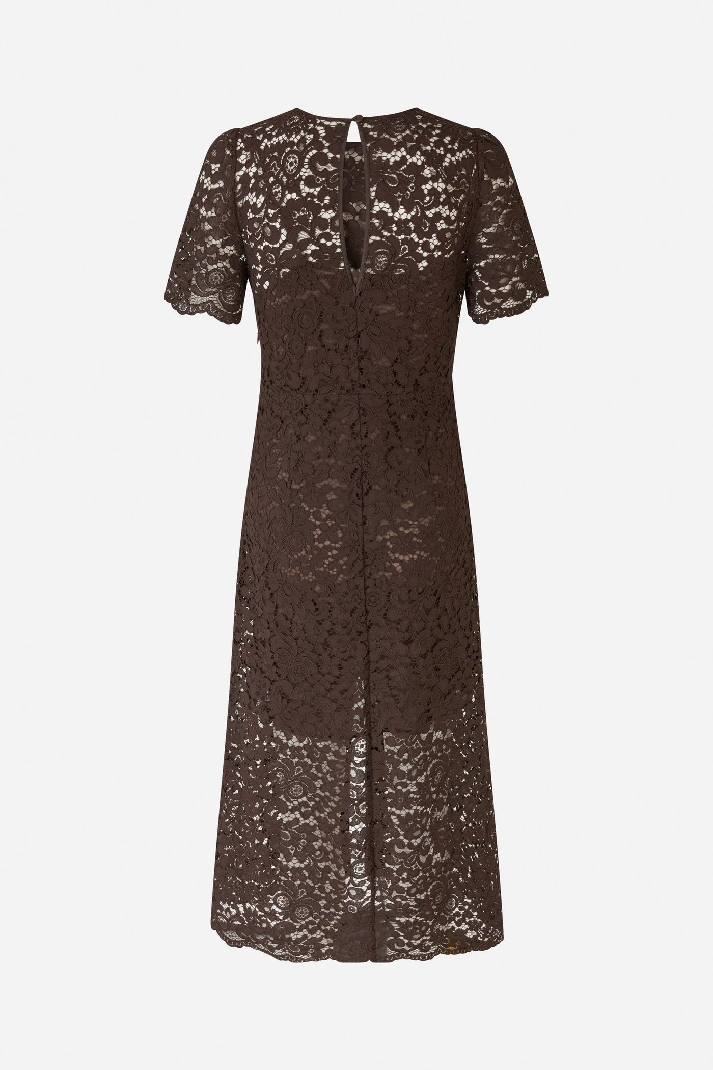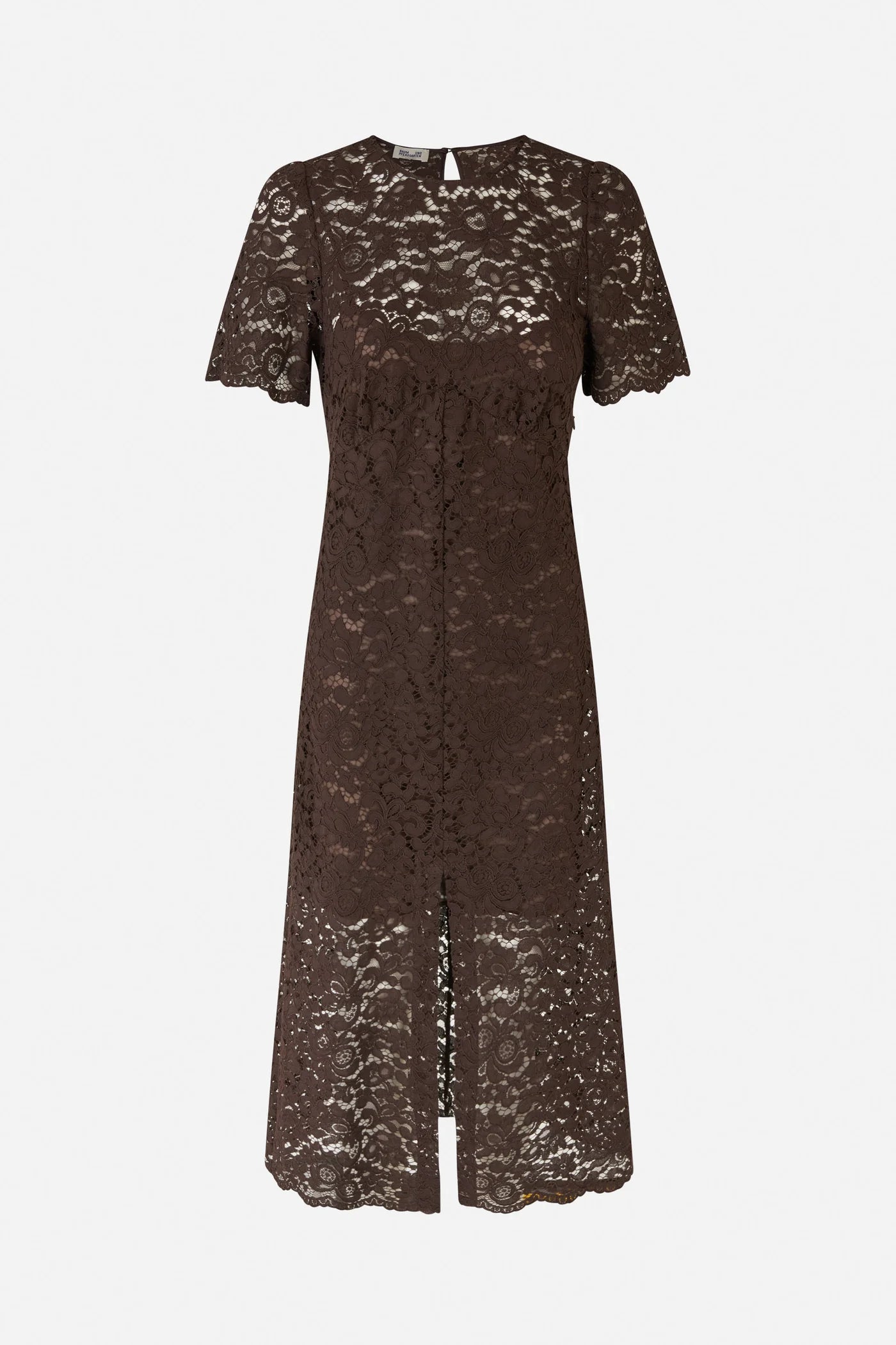 The Avigail Dress is a midi-length lace dress that embodies elegance with a modern twist. Its intricate lace design is complemented by a front slit for added sophistication and ease of movement. Featuring a scalloped hem and short sleeves, this dress offers a feminine and refined silhouette. The semi-sheer finish gives it a light, airy feel, making it perfect for special occasions or elevated daytime looks.