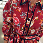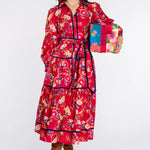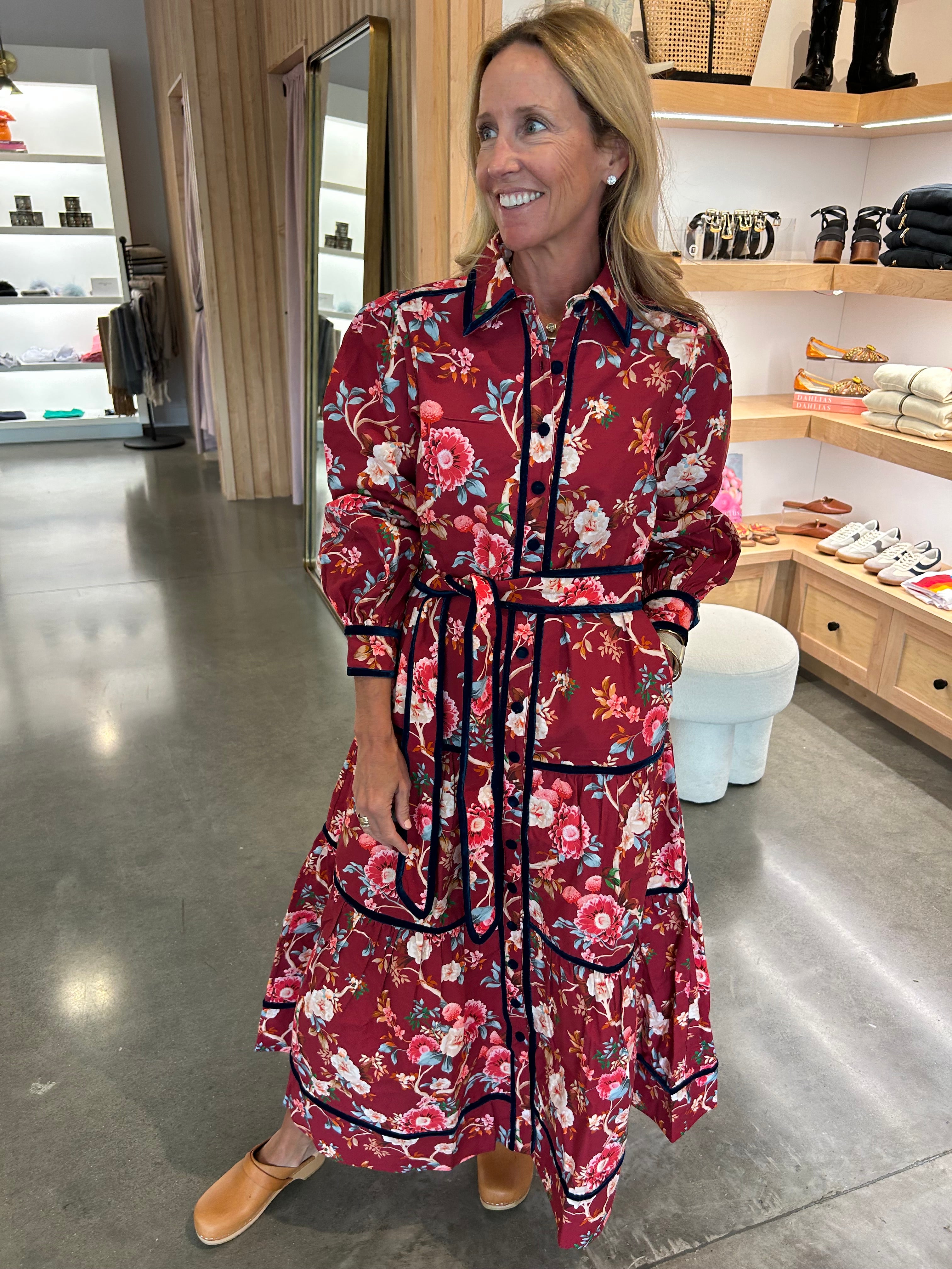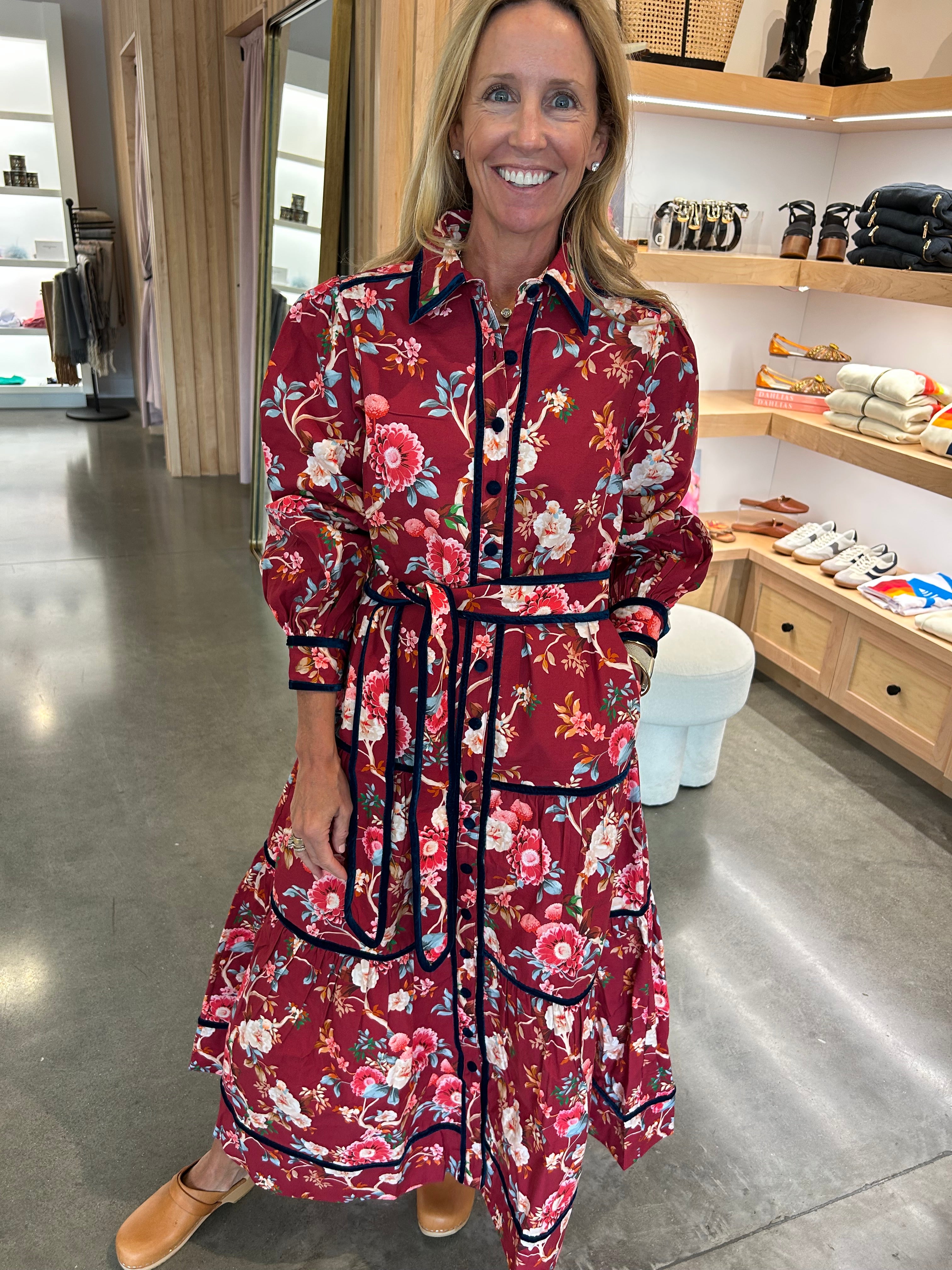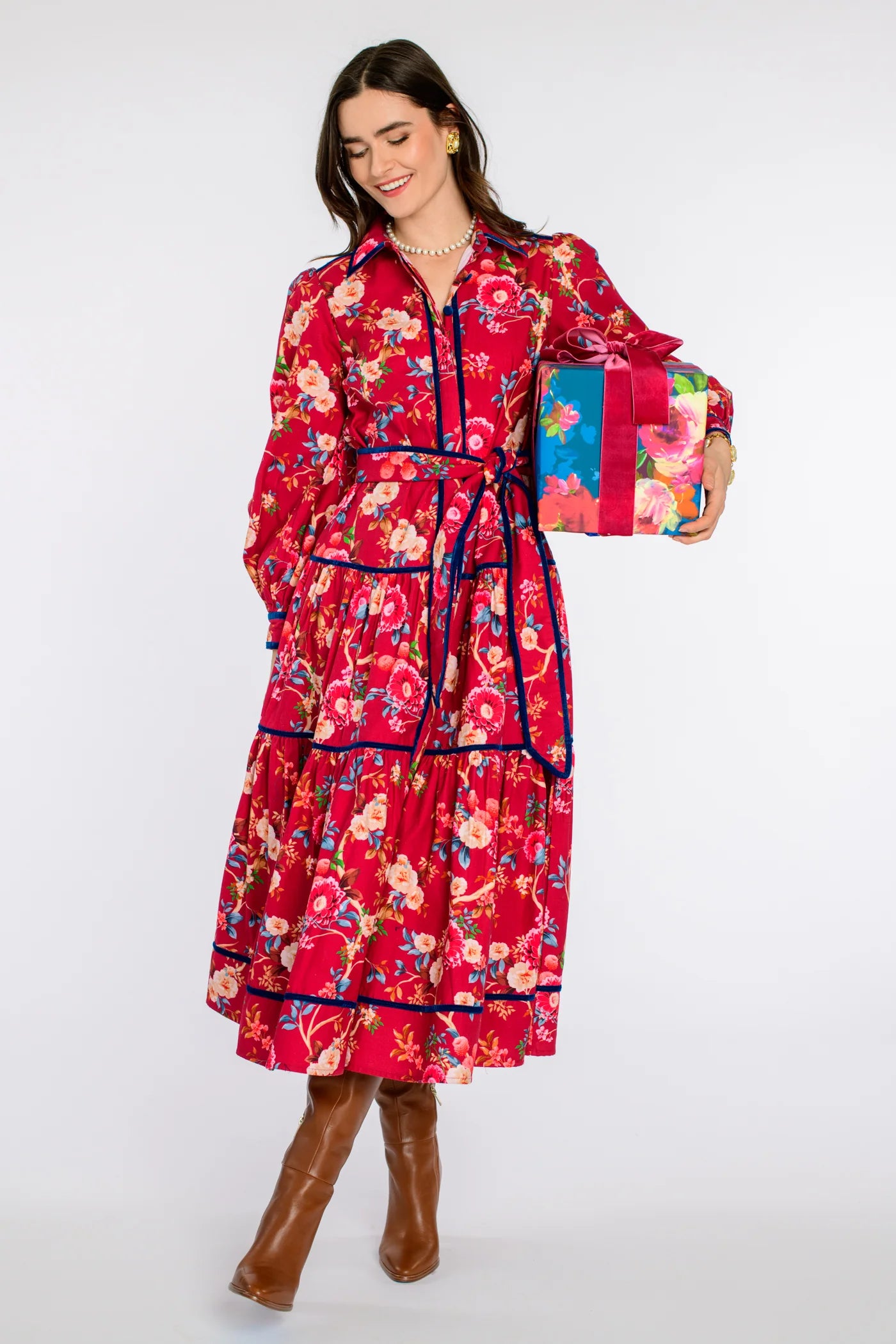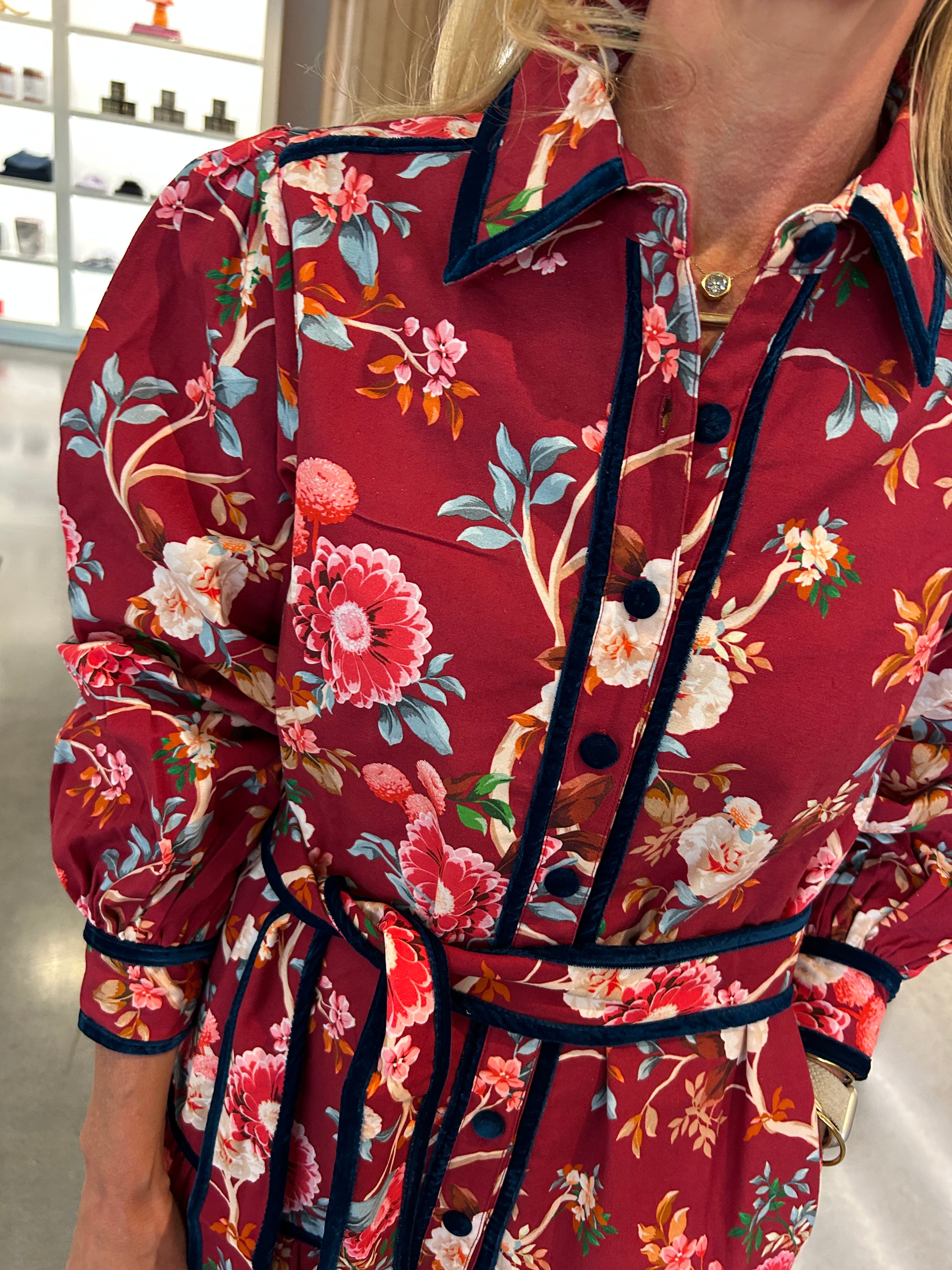 Beverly is a gorgeous long sleeve, midi-length shirt dress with balloon sleeves, a covered front placket, and tiered skirt. Her sash belt and skirt tiers are trimmed in navy velvet trim, beautifully complementing her Chinoiserie print.