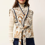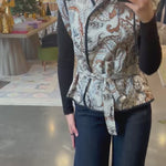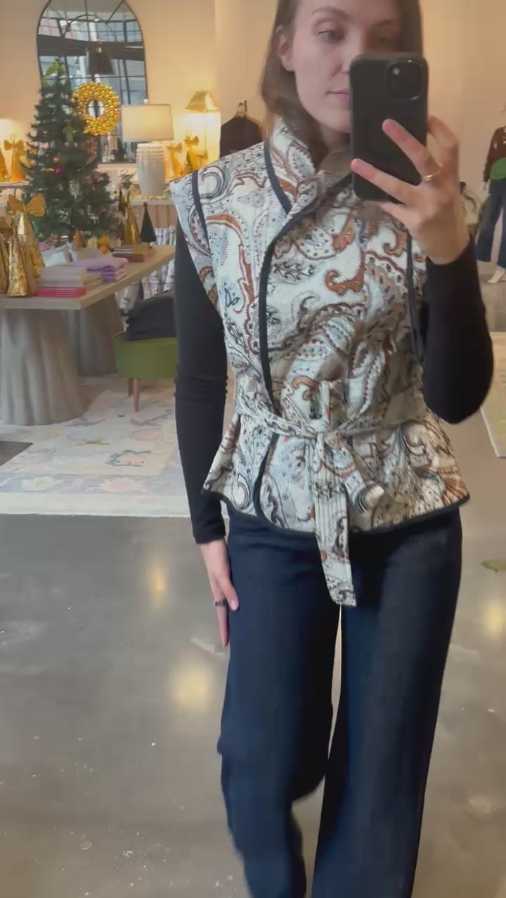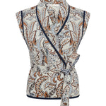 We’ve always leaned into assertive shapes with a decidedly feminine feel, and the Bowtie vest is no exception. A shawl collar wrap front balances a meandering paisley, while contemporary quilted cotton construction adds textual elegance. A trapunto stitch tie belt tailors the vest to your shape, along with an inside waist tie for an even more adjustable fit. We love how the vest can act as a statement piece on its own, or can be layered over matching Trinity print pieces like Eloise and Estine for a coordinated look.