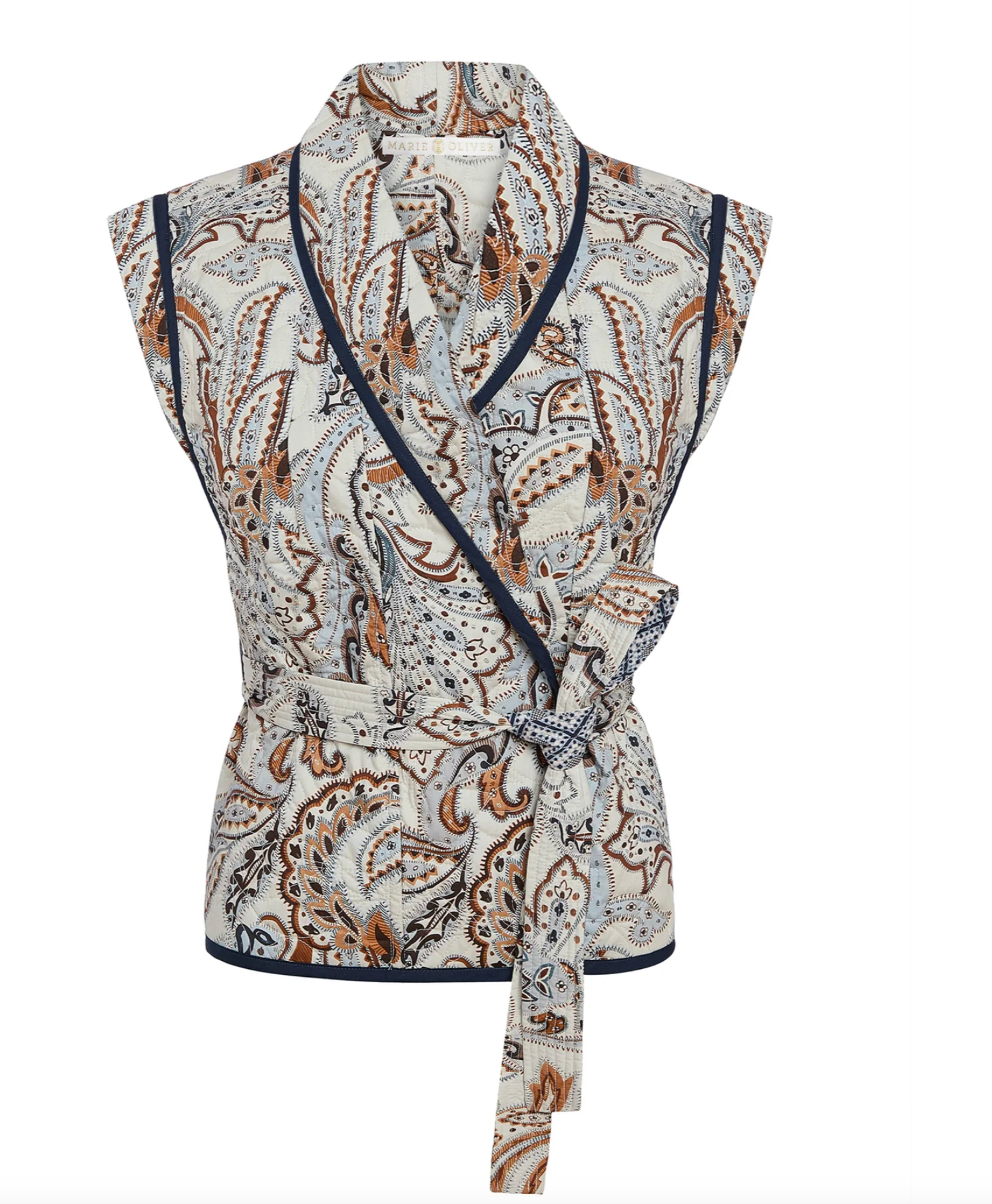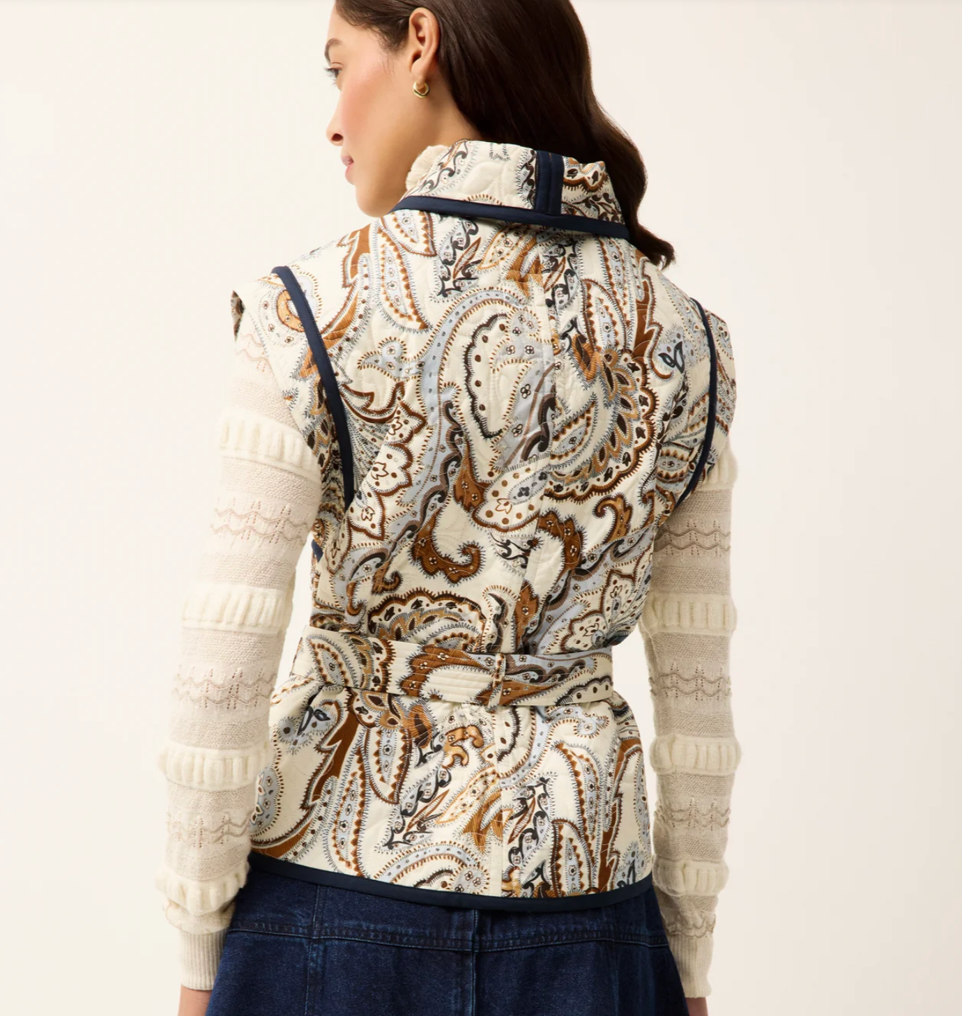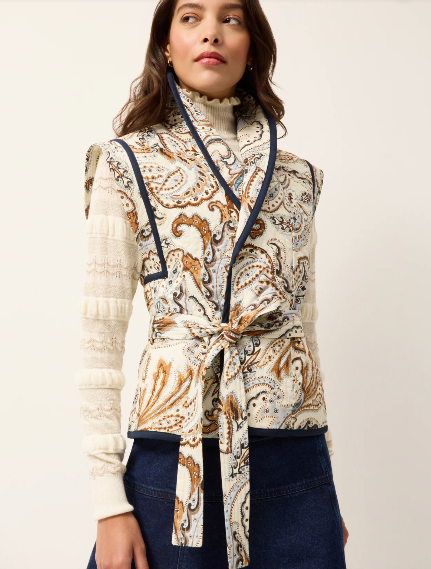 We’ve always leaned into assertive shapes with a decidedly feminine feel, and the Bowie vest is no exception. A shawl collar wrap front balances a meandering paisley, while contemporary quilted cotton construction adds textual elegance. A trapunto stitch tie belt tailors the vest to your shape, along with an inside waist tie for an even more adjustable fit.