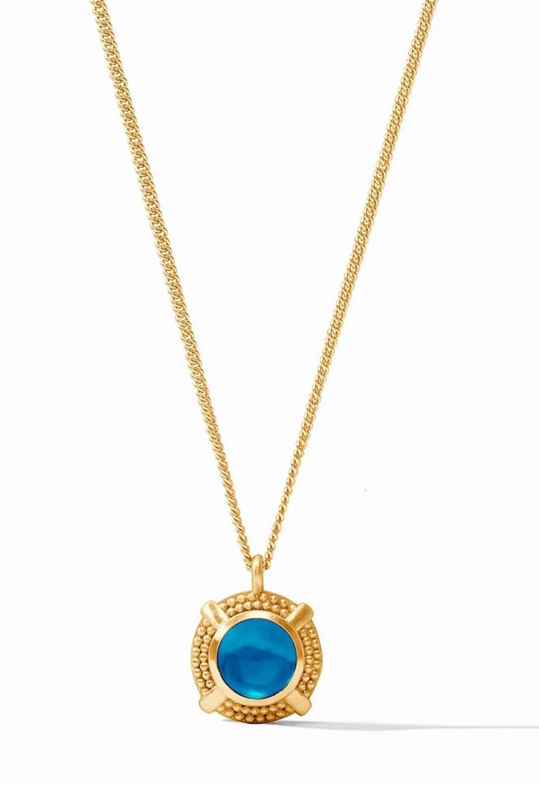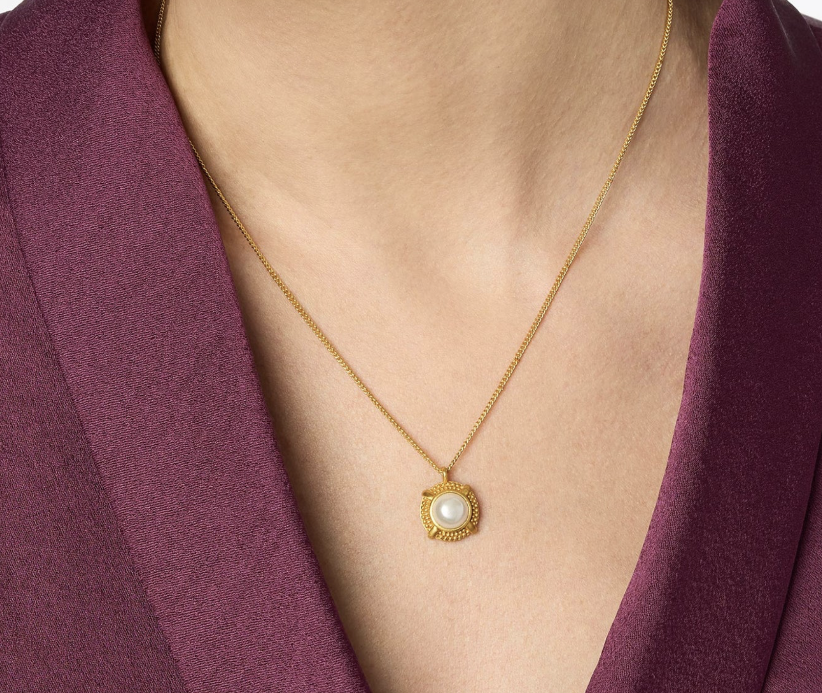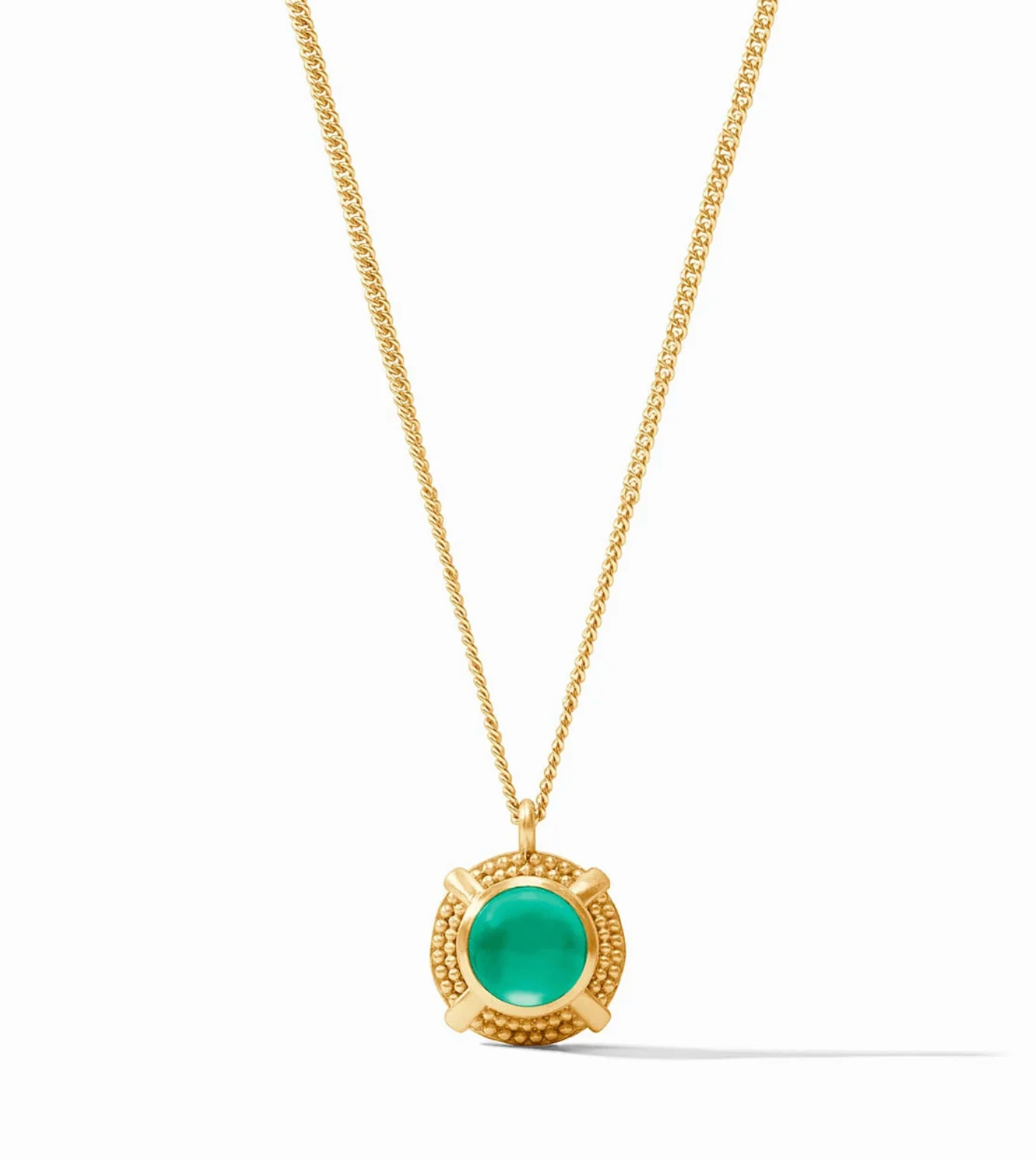 A polished round gemstone in a golden beaded setting with an X motif dangles from a delicate curb chain