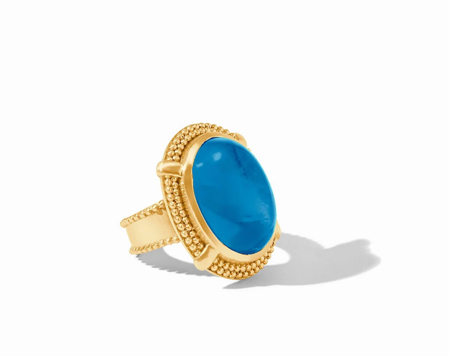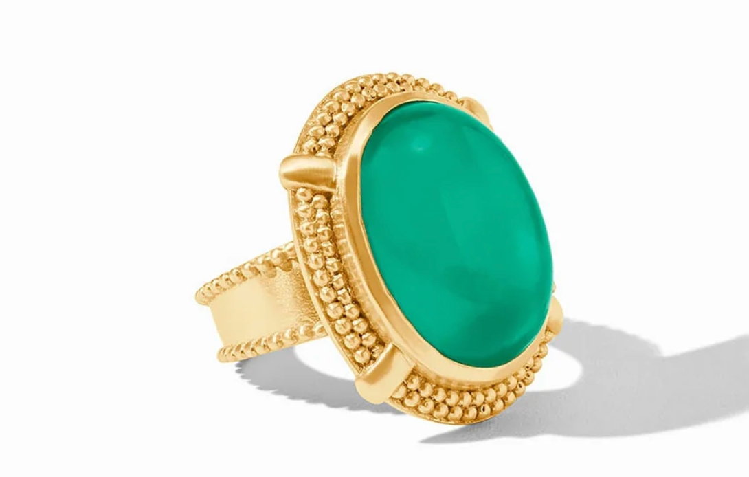 A polished oval gemstone in a golden beaded setting with an X motif and matching shank