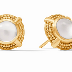 Polished round gemstone studs in a beaded golden setting with an X motif.