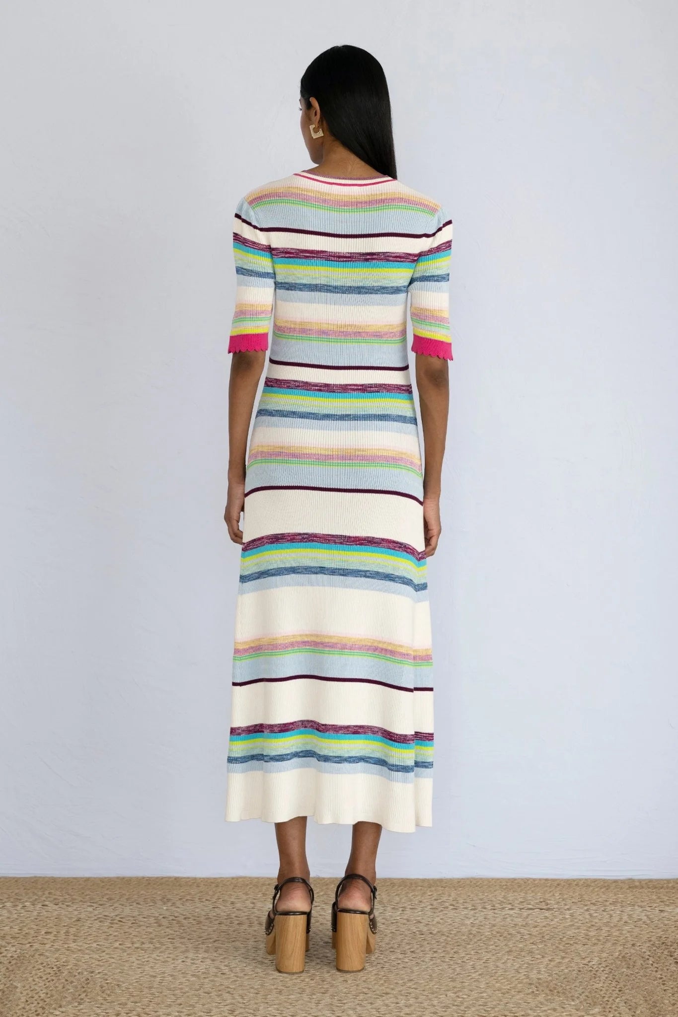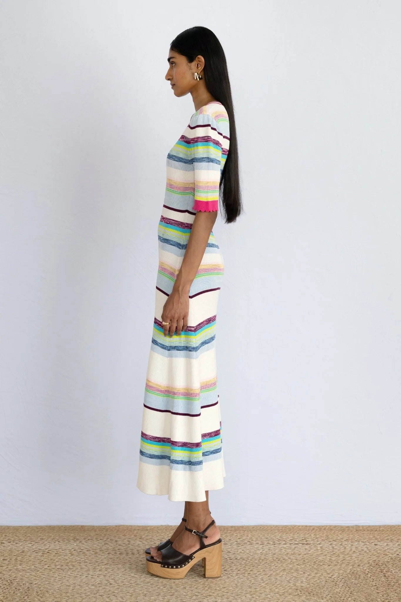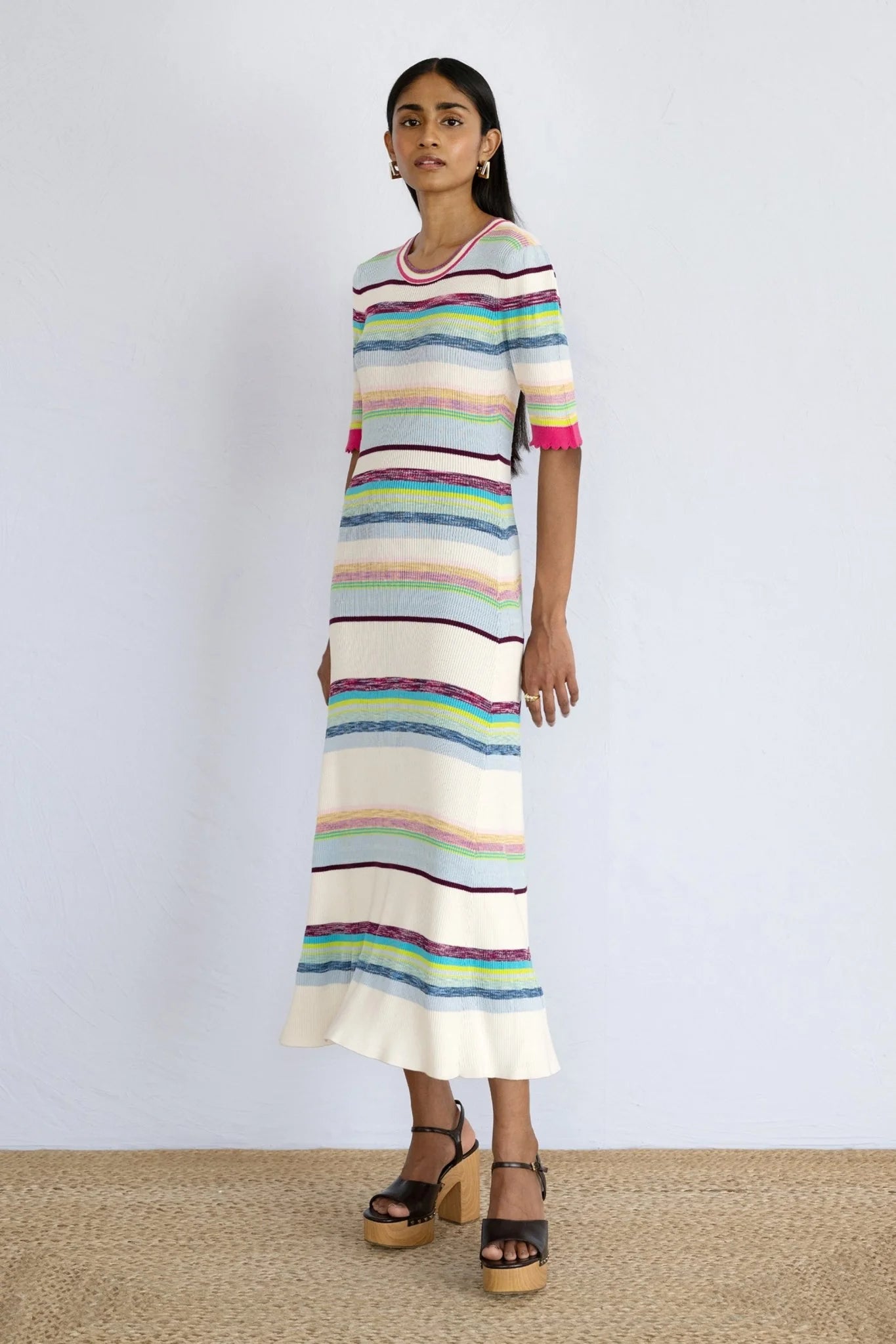 Celebrating colour and texture, this season's opal ombre knit stripes echo the optimism of the return of spring. The Calla dress offers simple elegance with a body-skimming silhouette and ribbed trims. Always a best-seller. Made from a cotton/rayon blend.