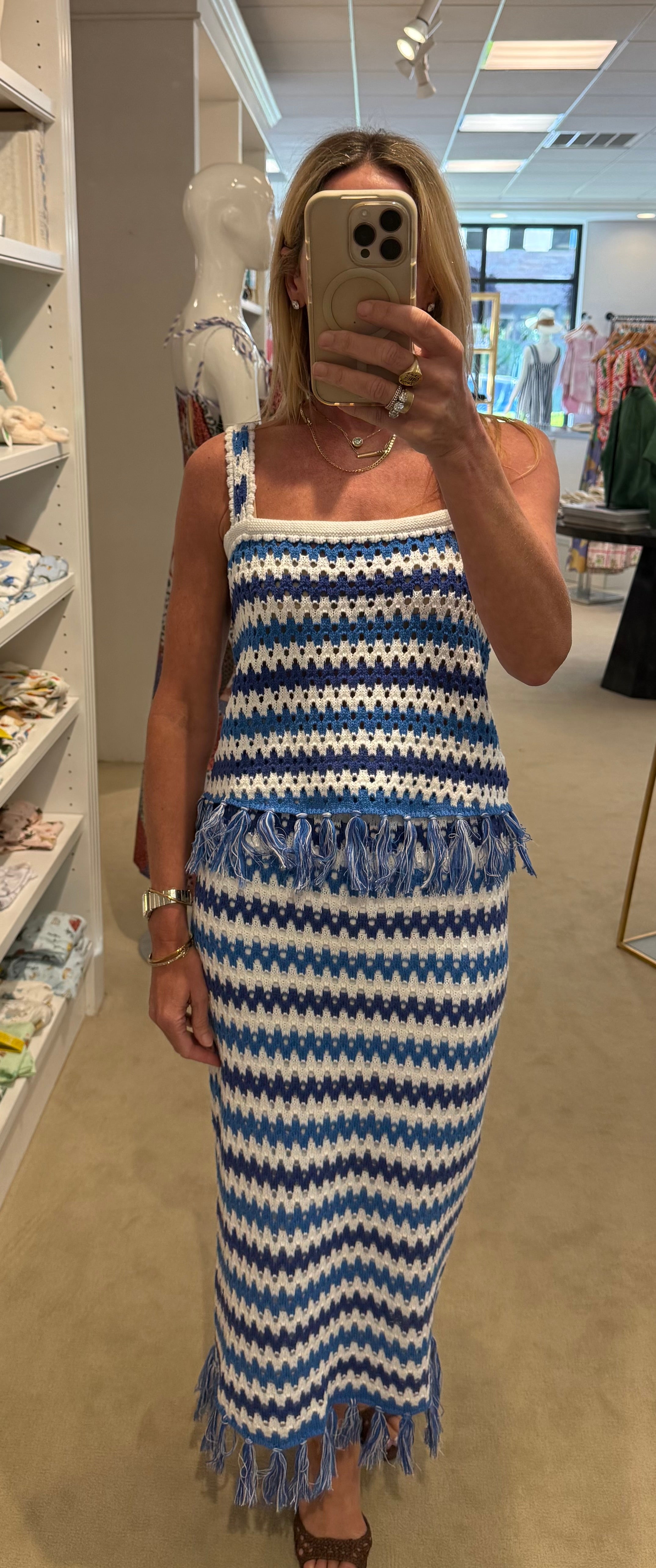 The Capri Knit Skirt features a comfortable stretch waistband and a tailored silhouette designed to flatter without clinging. Finished with fringe detailing along the hemline, it adds texture and fluid movement with every step. Designed to pair seamlessly with the matching Capri Knit Top, this skirt offers an easy, cohesive look that transitions effortlessly from vacation days to relaxed walks in the park.