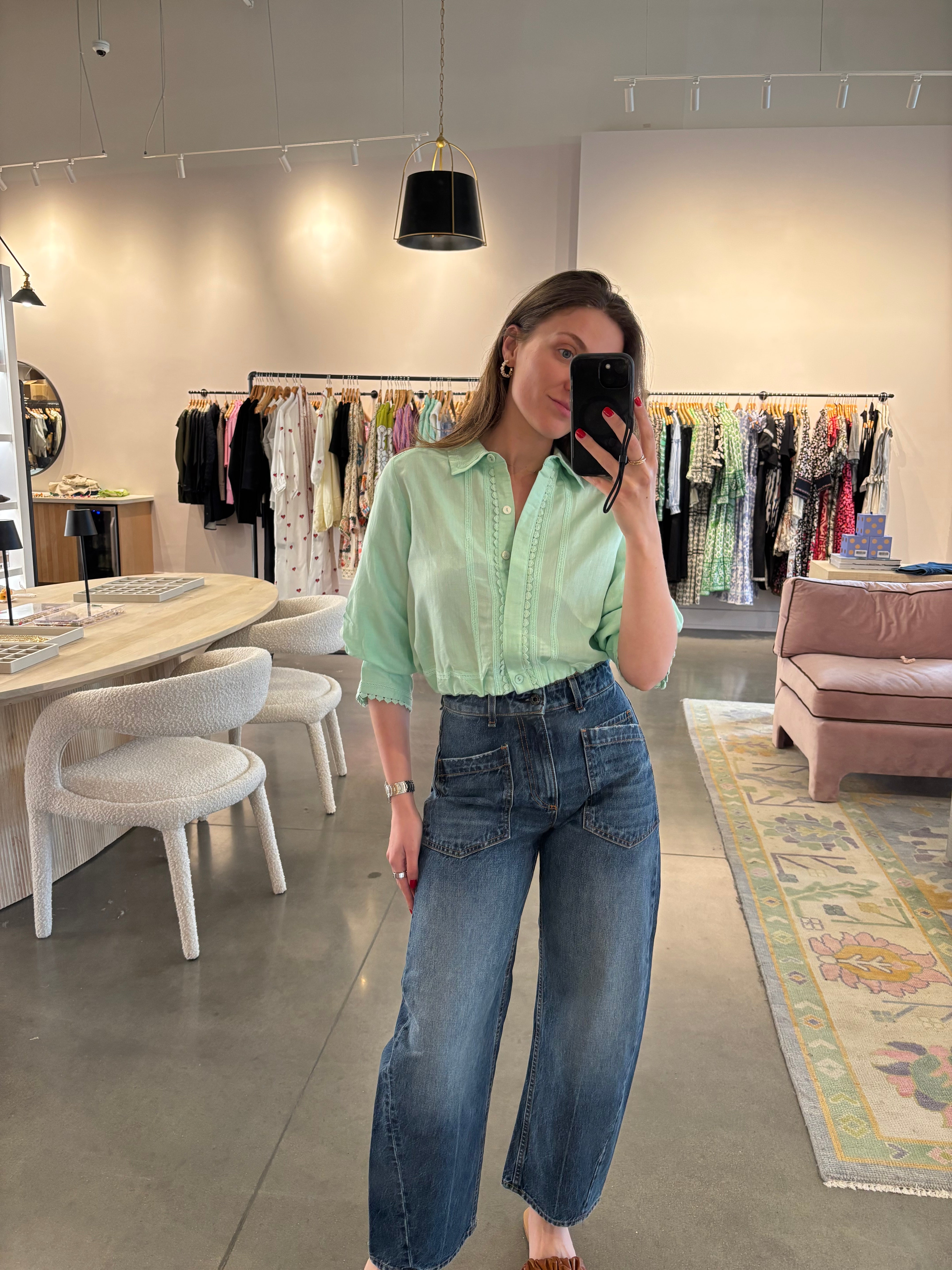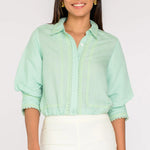 The Carter Top is a chic, waist-length button down with an elastic waistband and fun gathered sleeves. She lays perfectly with your favorite pants or skirts, providing full stomach coverage while avoiding a bulky tuck. Swap out a pair of high waisted pants for a fun skirt to bring this top from day to night.