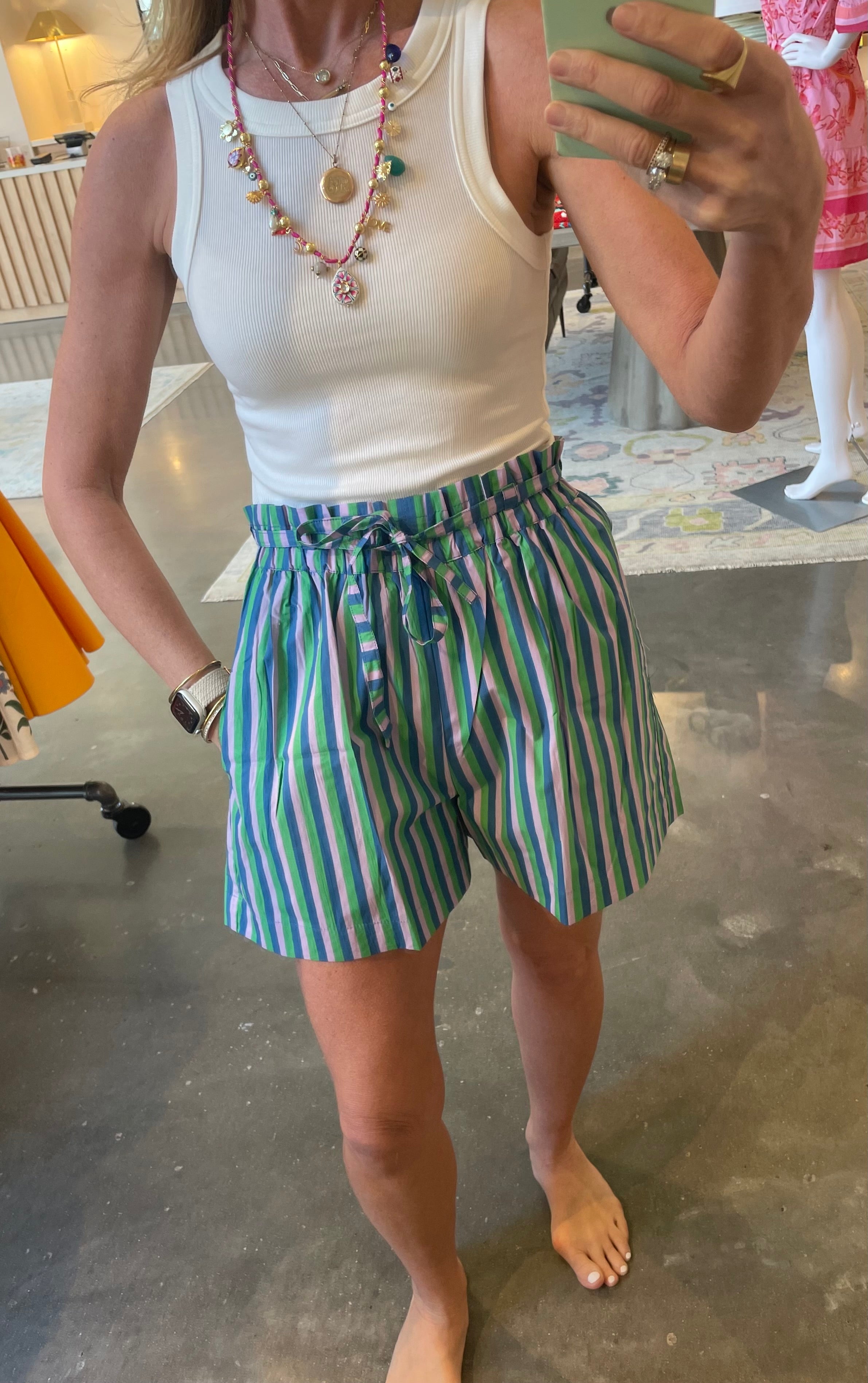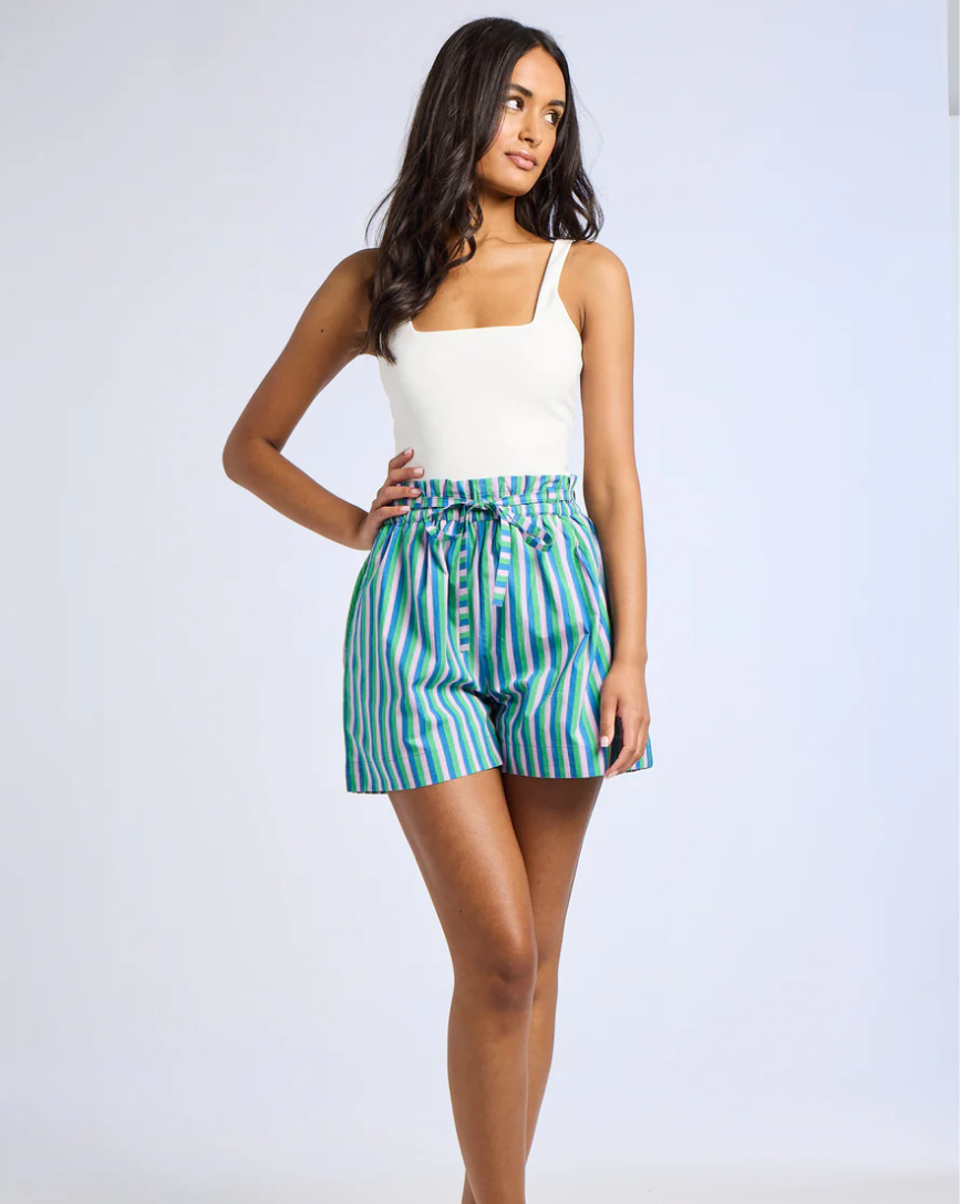 These easy shorts with a drawstring waist. Wear this with a matching top or a simple white tank. High rise, paper bag waist with slim tie belt in a light-weight cotton. Ideal for heading to the beach or for a stroll through town. Slash pockets.