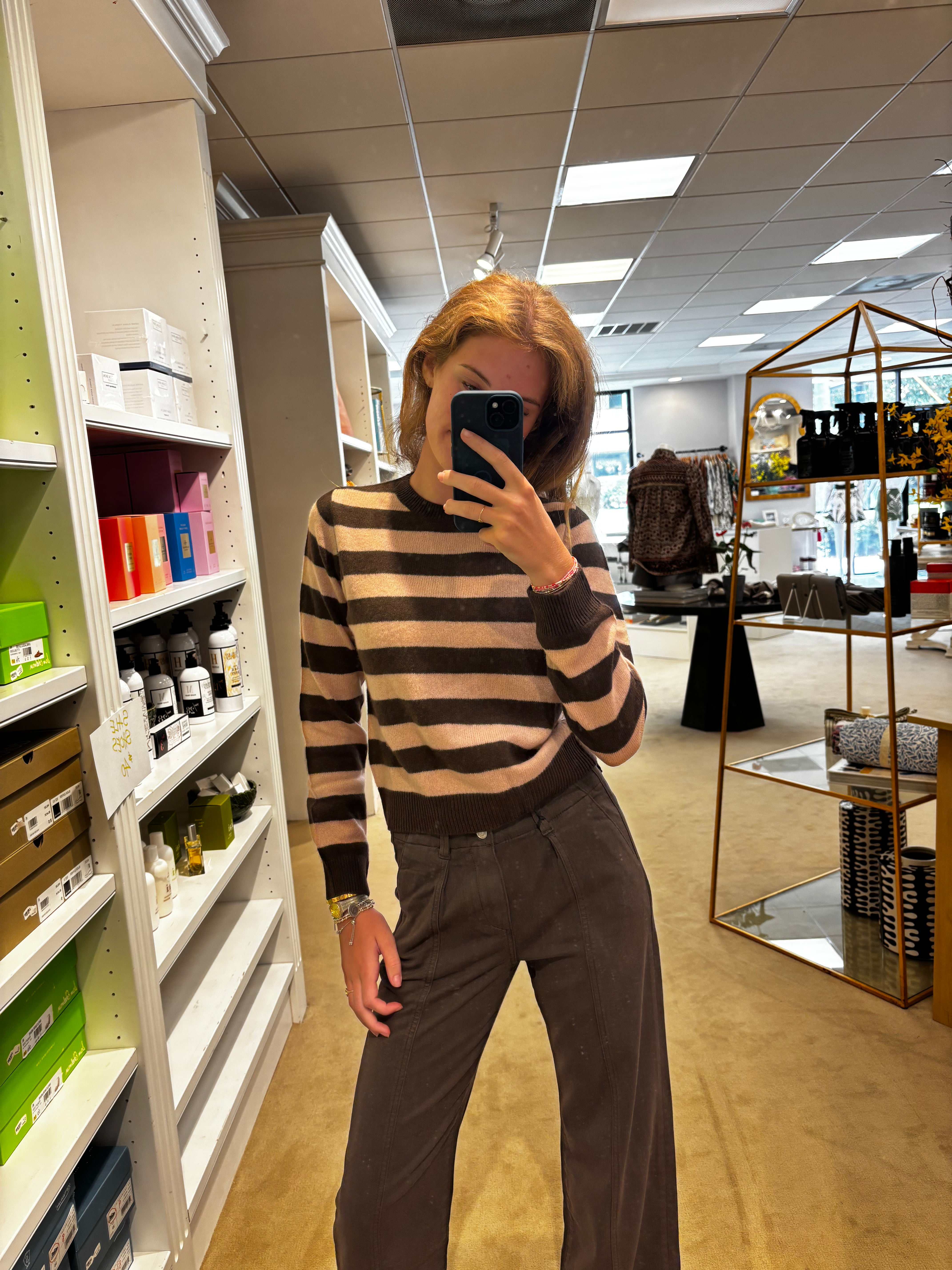 Cashmere Stripe Crew in Dark Brown and Pale Pink