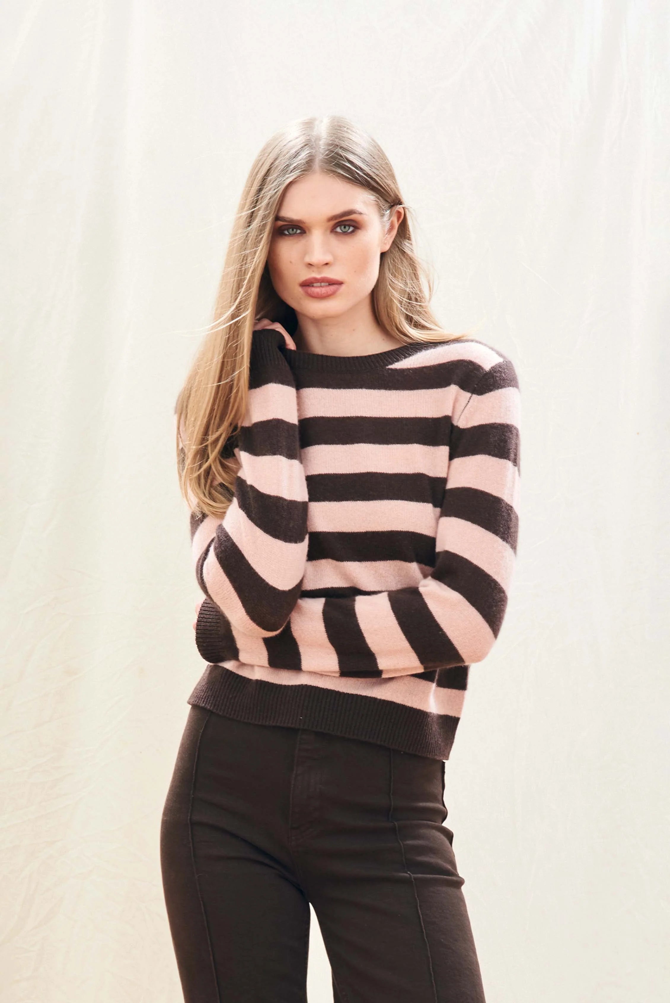 Jumper 1234 cashmere jumper. Our best selling lightweight cashmere stripe crew neck in dark brown and pale pink. True to size and 100% cashmere.