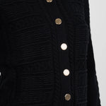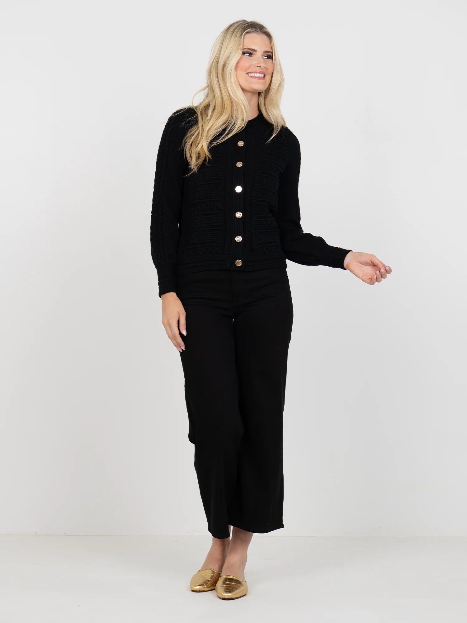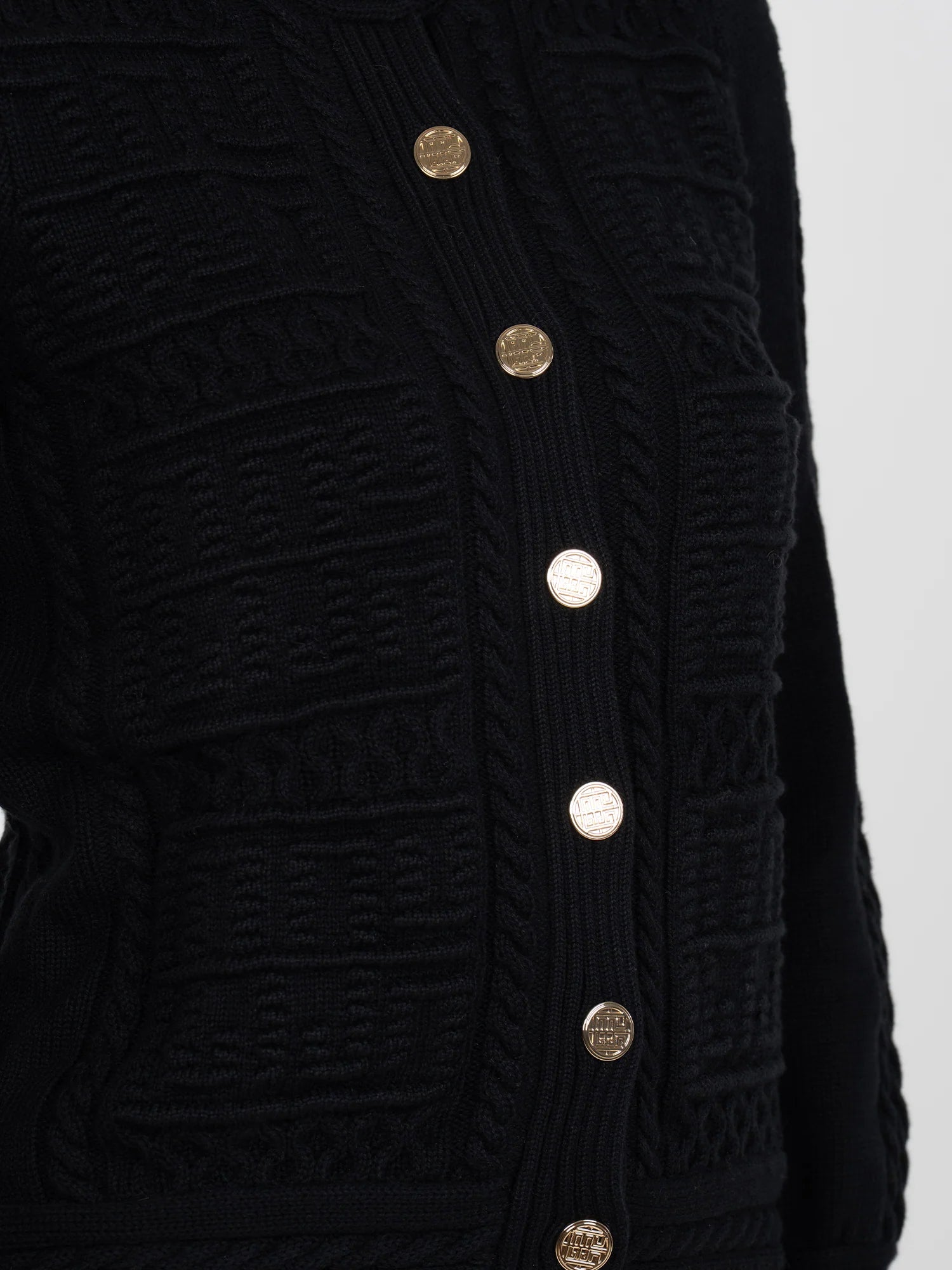 A modern classic with a signature twist. The Chloe Cardigan in Midnight Monogram redefines timeless knitwear with intricate cable detailing and a subtle woven monogram pattern throughout. Featuring a round neckline, relaxed silhouette, and our signature gold logo button closures, this elevated layer blends sophistication with everyday versatility. A true capsule wardrobe essential—wear it buttoned up for a polished finish or layered over a cami or graphic tee for an effortlessly chic look that stands the test of time.