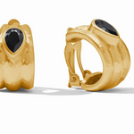 Inverted teardrop-shaped gemstones decorate these fluted, softly tapering golden clip-on hoops textured with subtle hand-hammering