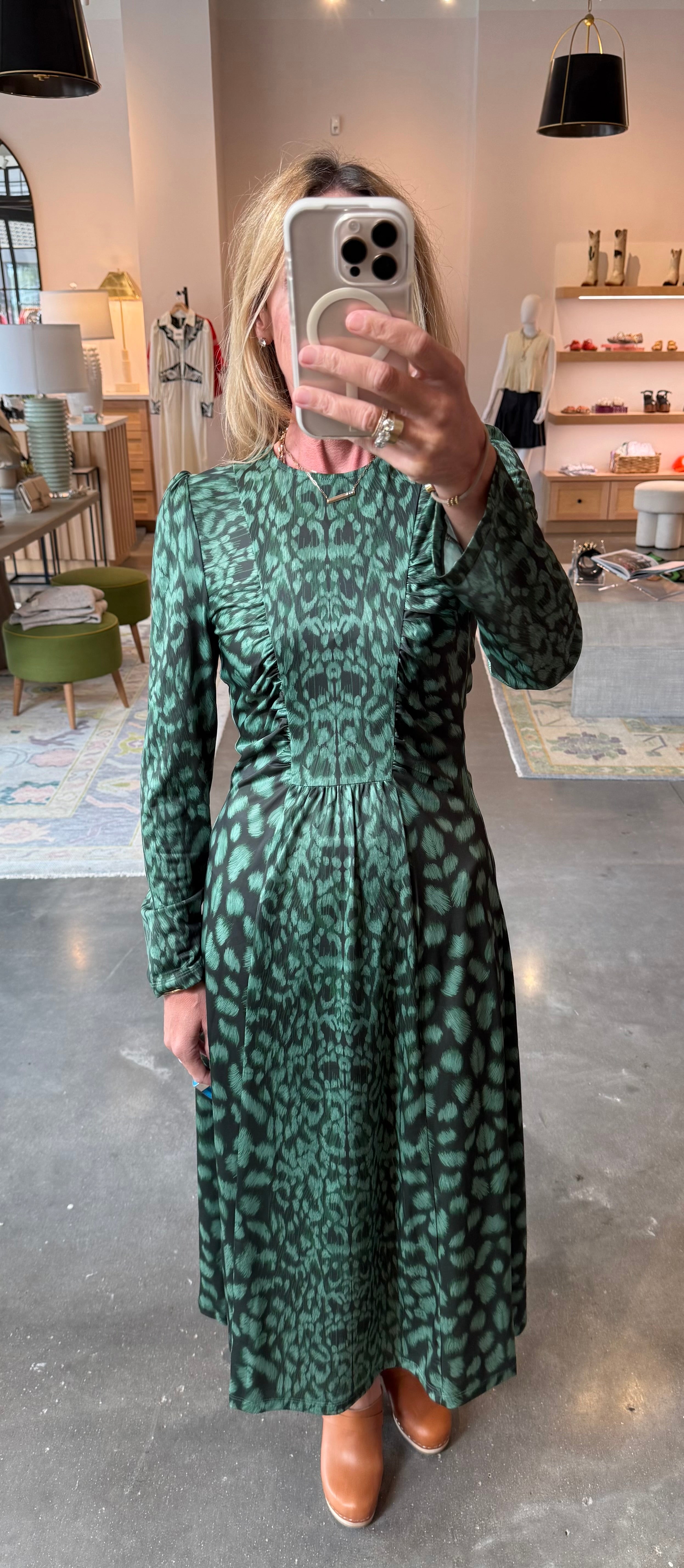 The Claude leopard print long sleeve dress is a timeless design with a modern twist. Featuring a ruched bodice and a sleek midi silhouette, this dress offers a flattering fit with minimal effort. Its understated elegance and bold animal print make it a perfect go-to for any occasion.