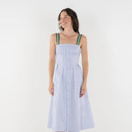 The Constance Midi in Grapemist Stripe offers a soft, feminine take on everyday dressing. Designed with an empire silhouette, this style is fitted through the bodice and flows into a flattering midi-length skirt. Adjustable straps and covered buttons along the front add thoughtful detail, while a side zip keeps the finish clean. Polished and easy to wear, it is ideal for spring gatherings, date nights, and moments that call for a graceful touch.