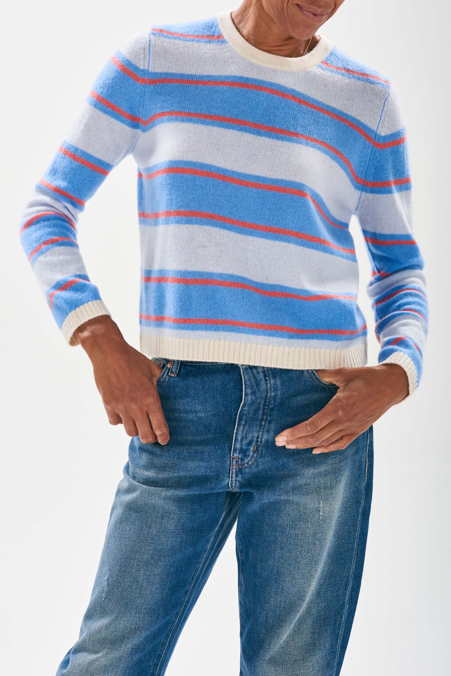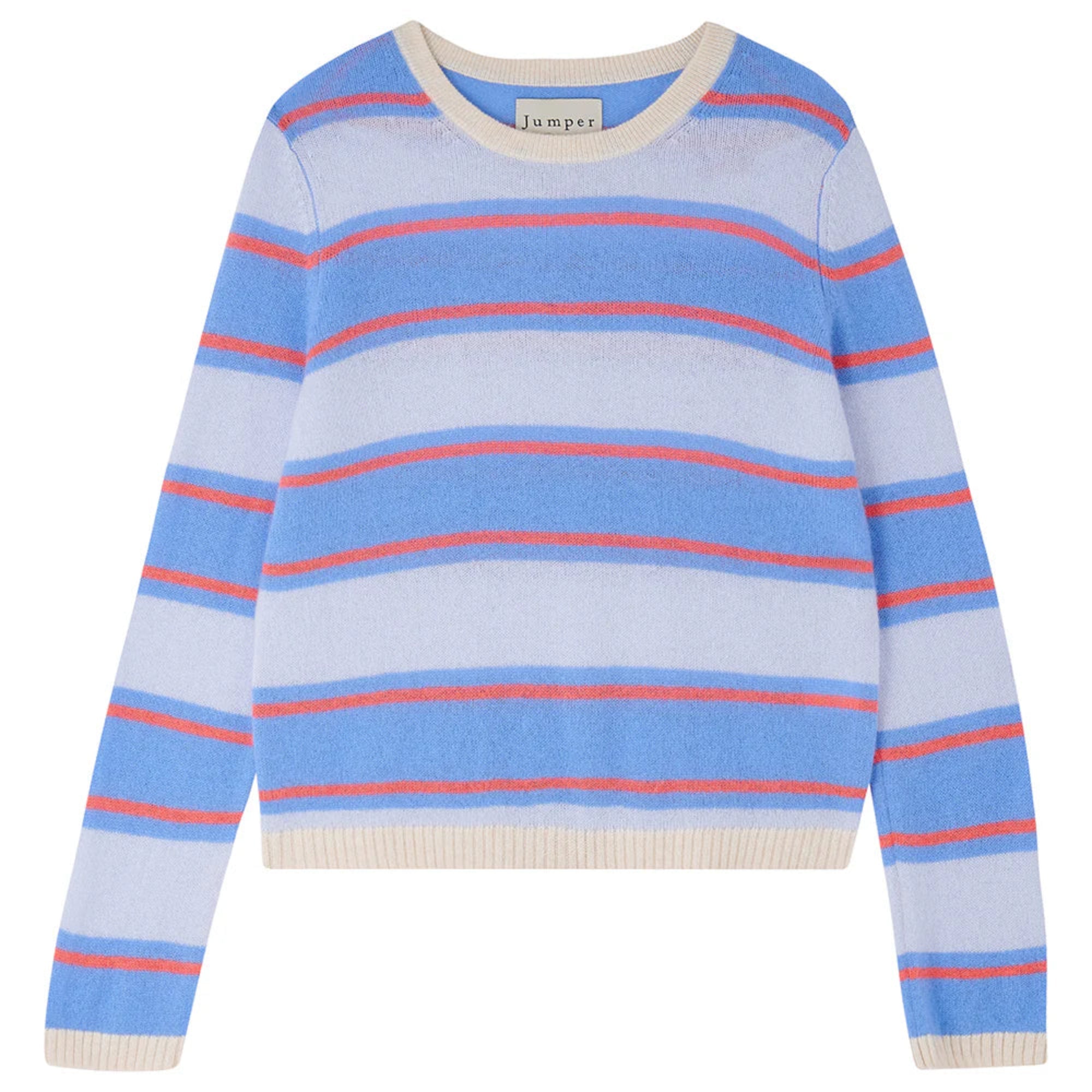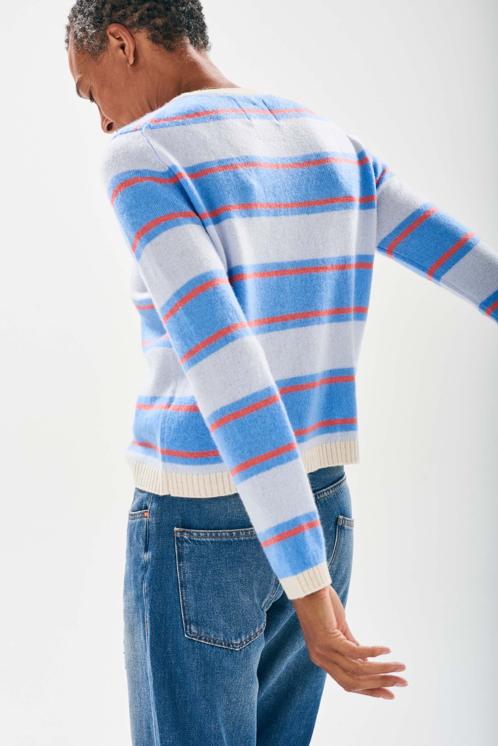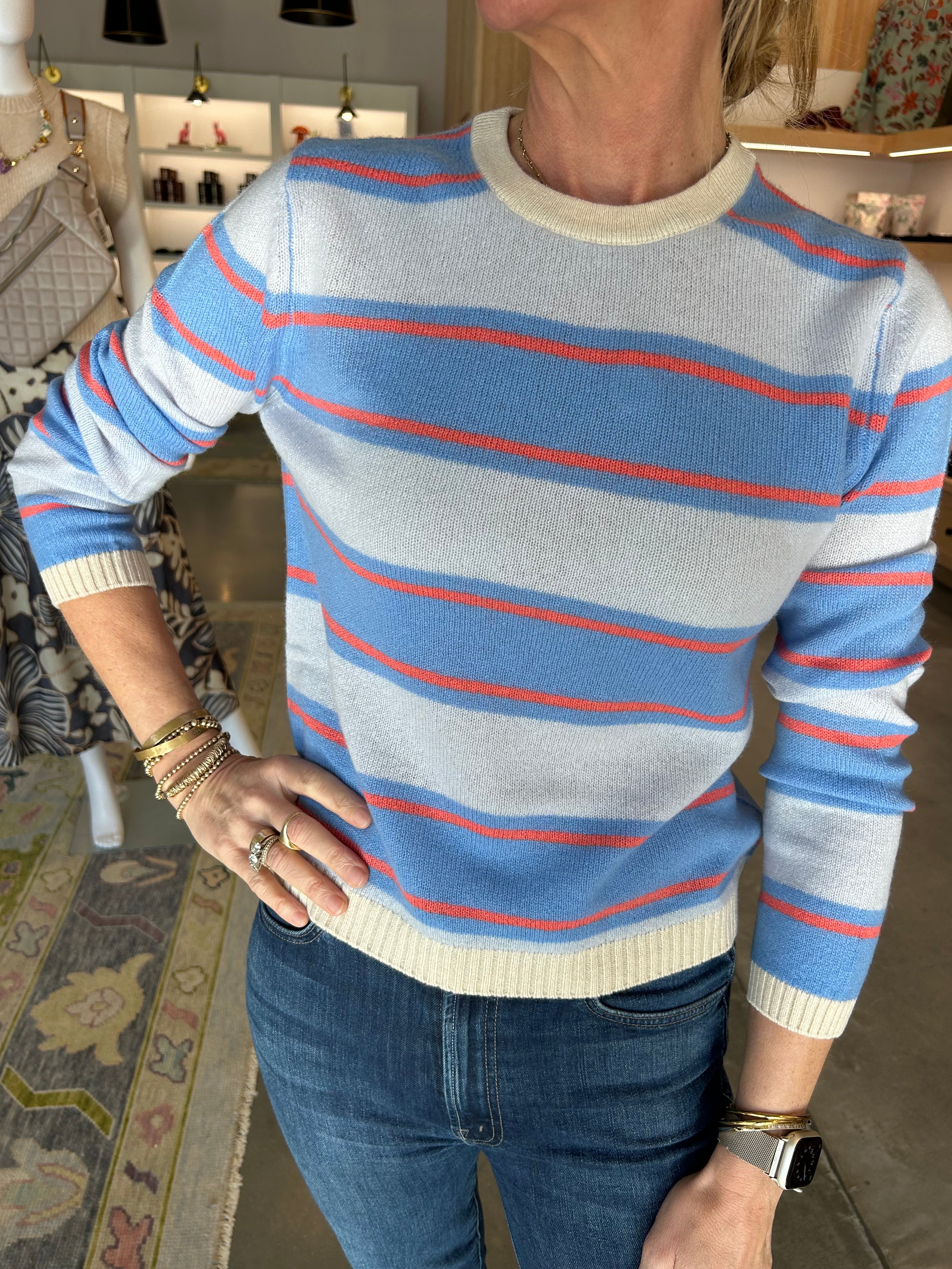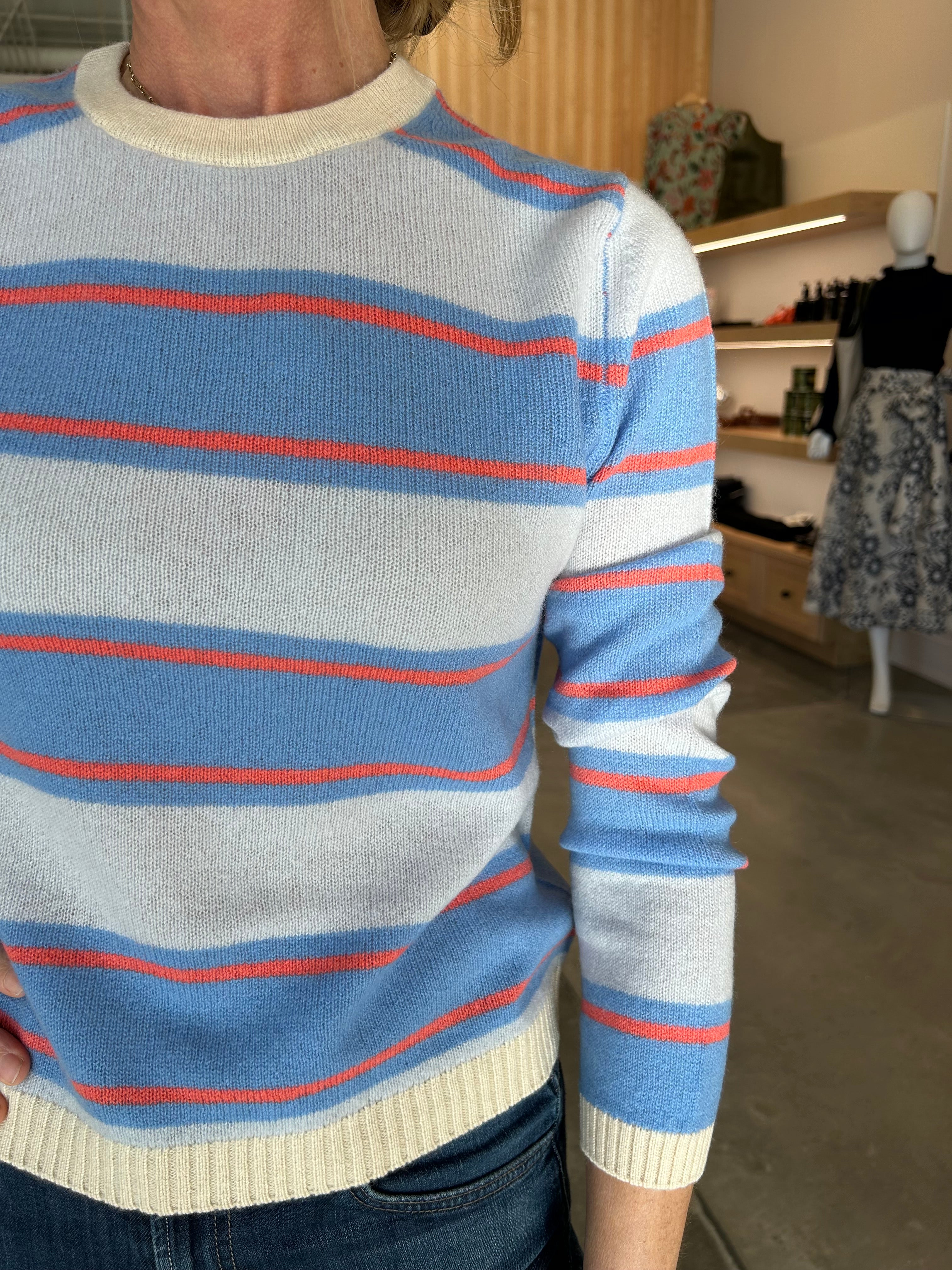 In love with these new additions to our sweater collection! In perfect time for cooler spring days ahead! Jumper 1234 cashmere jumper. Pale blue and sky striped cashmere crew neck jumper with oatmeal ribs and a narrow mandarin stripe too.