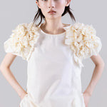 This poplin top combines comfort and softness with a relaxed, contemporary silhouette. The round neckline adds a clean, streamlined look to the torso, while the short sleeves embellished with flowers introduce a feminine, handcrafted detail that subtly enhances the garment.