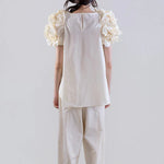 The rounded hem with small off-center slits adds movement and lightness, creating a harmonious contrast with the simplicity of the top. Made from soft poplin, this top offers comfort, versatility, and a refined touch, making it an ideal piece for modern and feminine daytime looks.