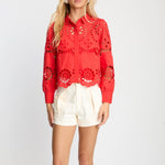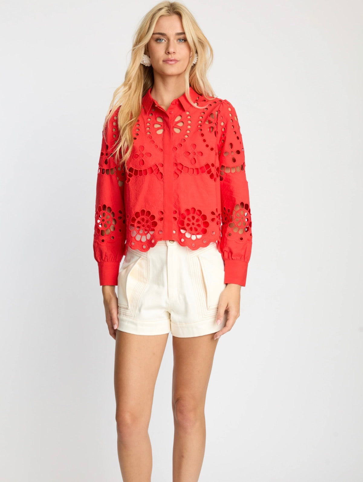 Make a statement in our Emmie Top in Poppy Red Eyelet Lace. Made from cotton, this top offers a delicate, floral-inspired design with a subtle peek of skin and a touch of bohemian charm. The classic button-down silhouette is updated with long sleeves and a scalloped hem, striking the perfect balance of refined sophistication and playful detail.