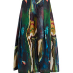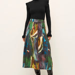 Faith is a tailored midi skirt defined by a fixed waistband and feminine box pleats that add movement and a slight flare. Shown here in our new Delta print, a moody swirl of striated color in an autumnal palette.