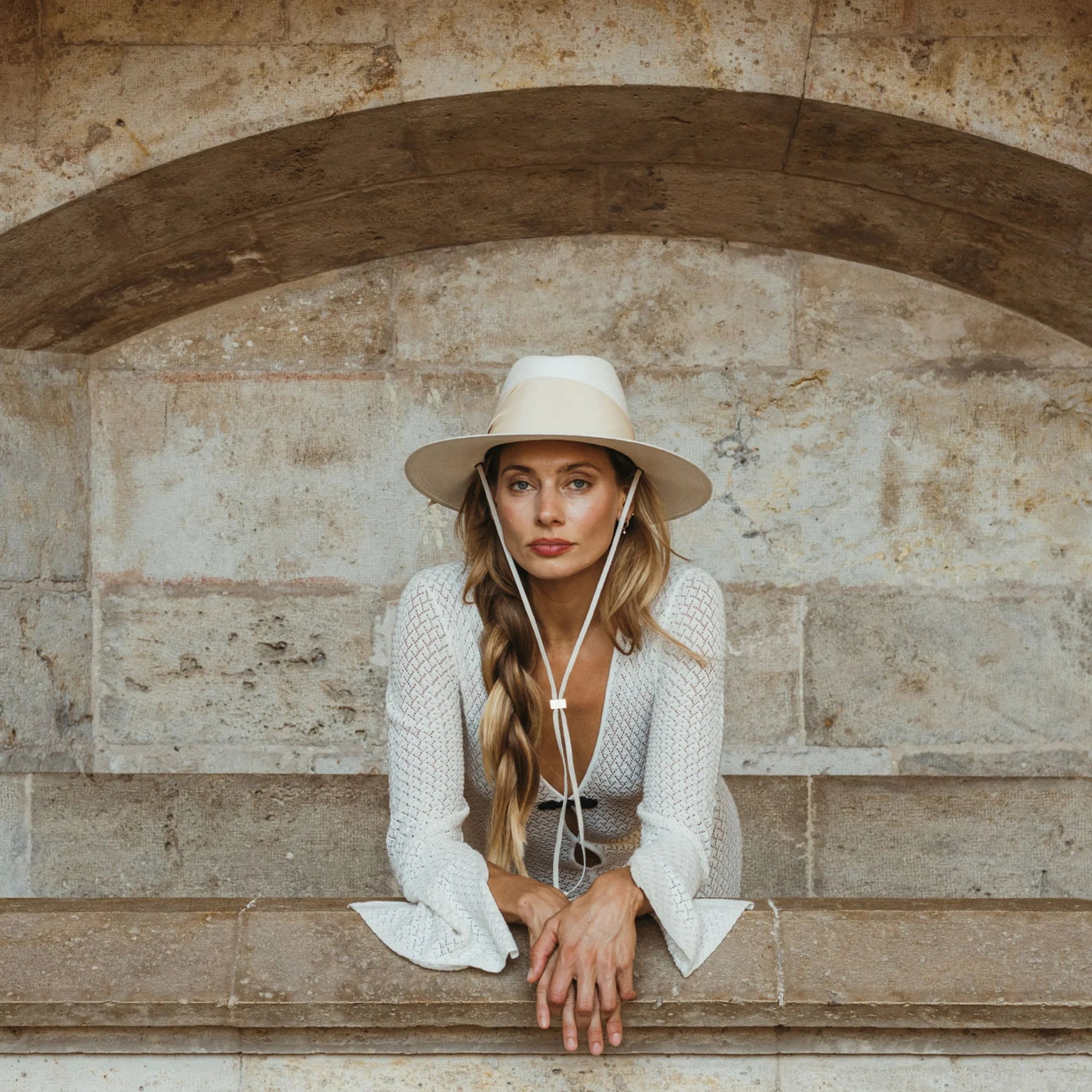 - This hat is an updated version of our perennial bestseller, the Gardenia. Featuring our newest crown shape with a distinct center crease along the top of the crown and bone suede chin strap. The hat is decorate with and oversized bone grosgrain band, wrapped asymmetrically and finished with modern angular fold.