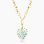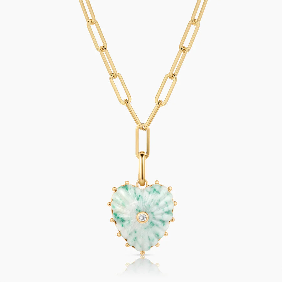 This super adjustable paperclip chain is elevated to new heights with our Malene heart charm in green dot jasper. Hand-carved stone, cubic zirconia, and high-shine gold. Everything you want and need in a statement necklace
