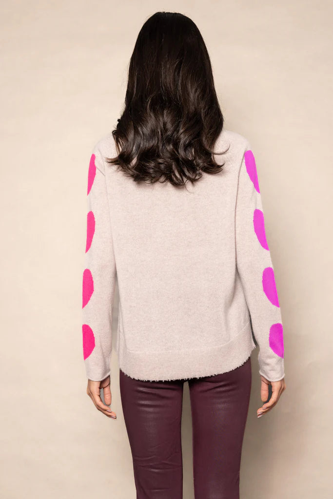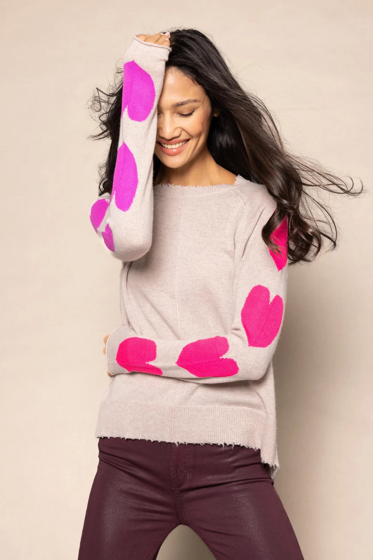 Wear your heart on your sleeve with style in our raw edge crew neck sweater with contrast heart intarsia down each arm.