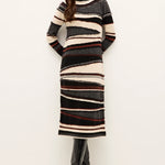 Sweater dresses fall into that rare style category of one-and-done outfits that are as easy to wear as they are sophisticated. Hesta’s mixed media construction with fringe detailing and geometric slashes of autumnal color lends the cozy silhouette an avant-garde edge.