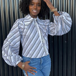 The Hopewell Top is your new go-to for elevated everyday style. Featuring dramatic balloon sleeves, a high neckline, and crisp charcoal-and-white stripes, this blouse strikes the perfect balance between bold and timeless. Pair it with denim for a chic daytime look or tuck it into tailored pants for instant sophistication.