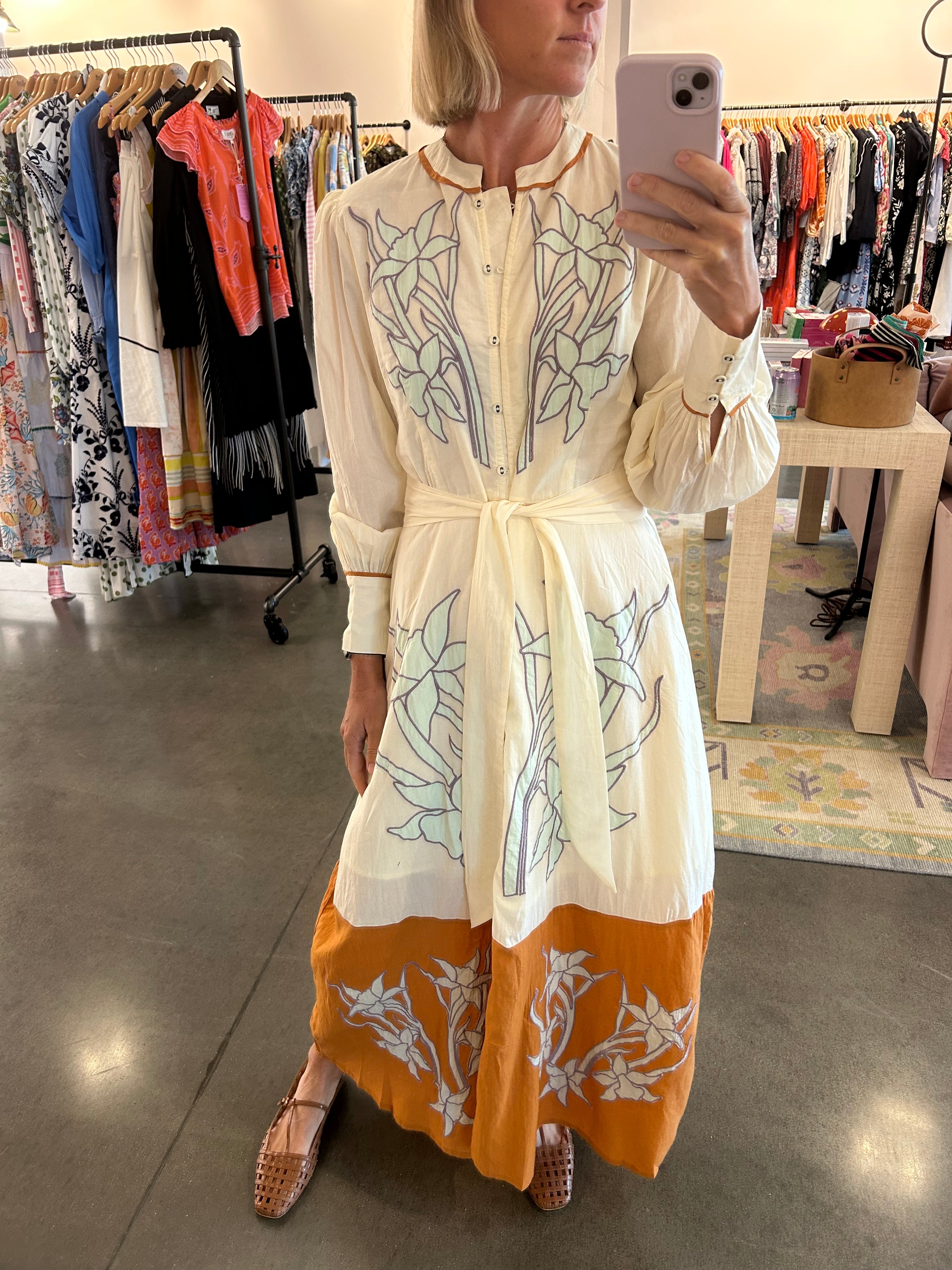 Loving this combination of fall colors in this dress. Button front. Tie Waist.