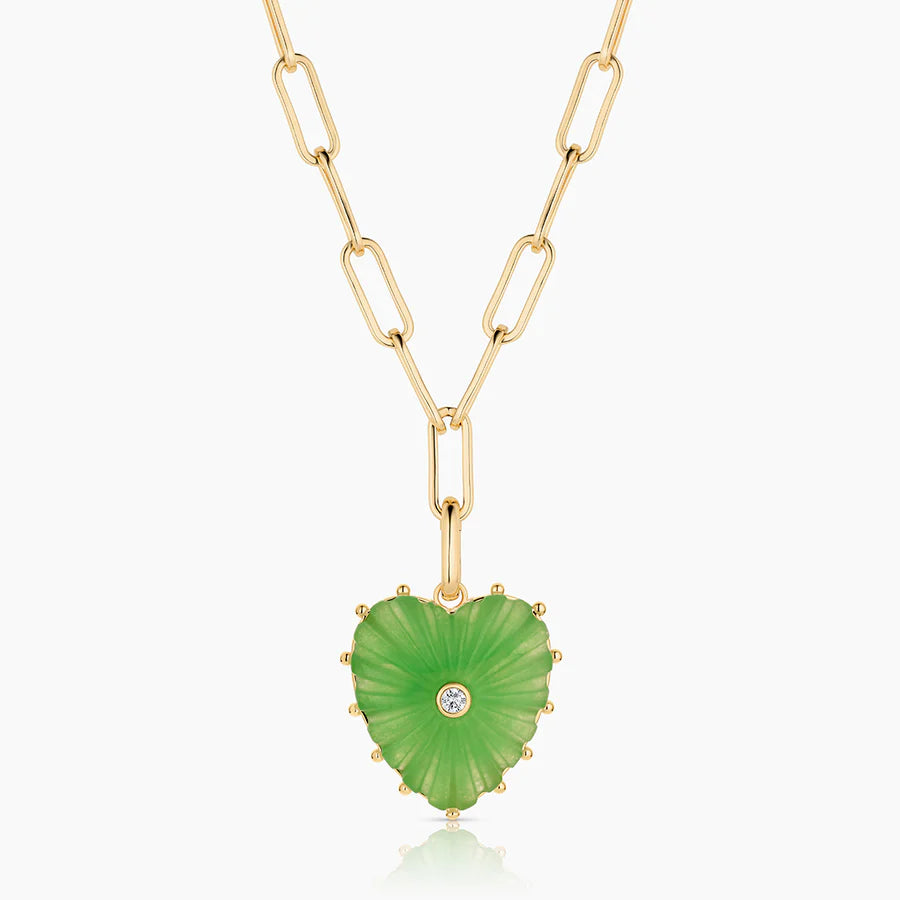 This super adjustable paperclip chain is elevated to new heights with our Malene heart charm in light green jade. Hand-carved stone, cubic zirconia, and high-shine gold. Everything you want and need in a statement necklace.