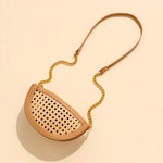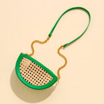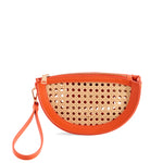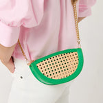 The Lyra Crescent Cross-Body/Wristlet blends versatility with standout style. This half-moon silhouette features a woven cane front panel trimmed in sleek vegan leather for a warm-weather statement that’s both playful and polished. Designed with two interchangeable straps—a gold chain cross-body and a matching vegan leather wristlet—it transitions effortlessly from day to night. A top zip closure and inner slip pocket keep your essentials secure and close at hand.
