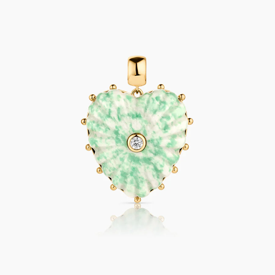 Our Malene heart charm in the unique speckled green dot jasper—hand-carved stone, cubic zirconia, and high-shine gold on a large round bail for versatility. Everything you want and need to make a statement.