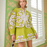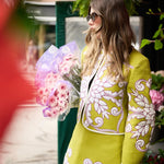 Named after Lawson’s great-grandmother, who passed down the art of sewing through her family, the Mimi Quilted Jacket is a piece stitched with love and legacy. Born from Lawson’s MFA collection, this fitted jacket in an electric chartreuse features sculptural barrel sleeves, framed with white floral appliqué and outlined in maroon embroidery. Wear it with the matching mini skirt for a full look, or style it with jeans and a tank for something more casual. Designed to be worn, loved, and passed down, just like the craft and Portuguese tile work that inspired it.