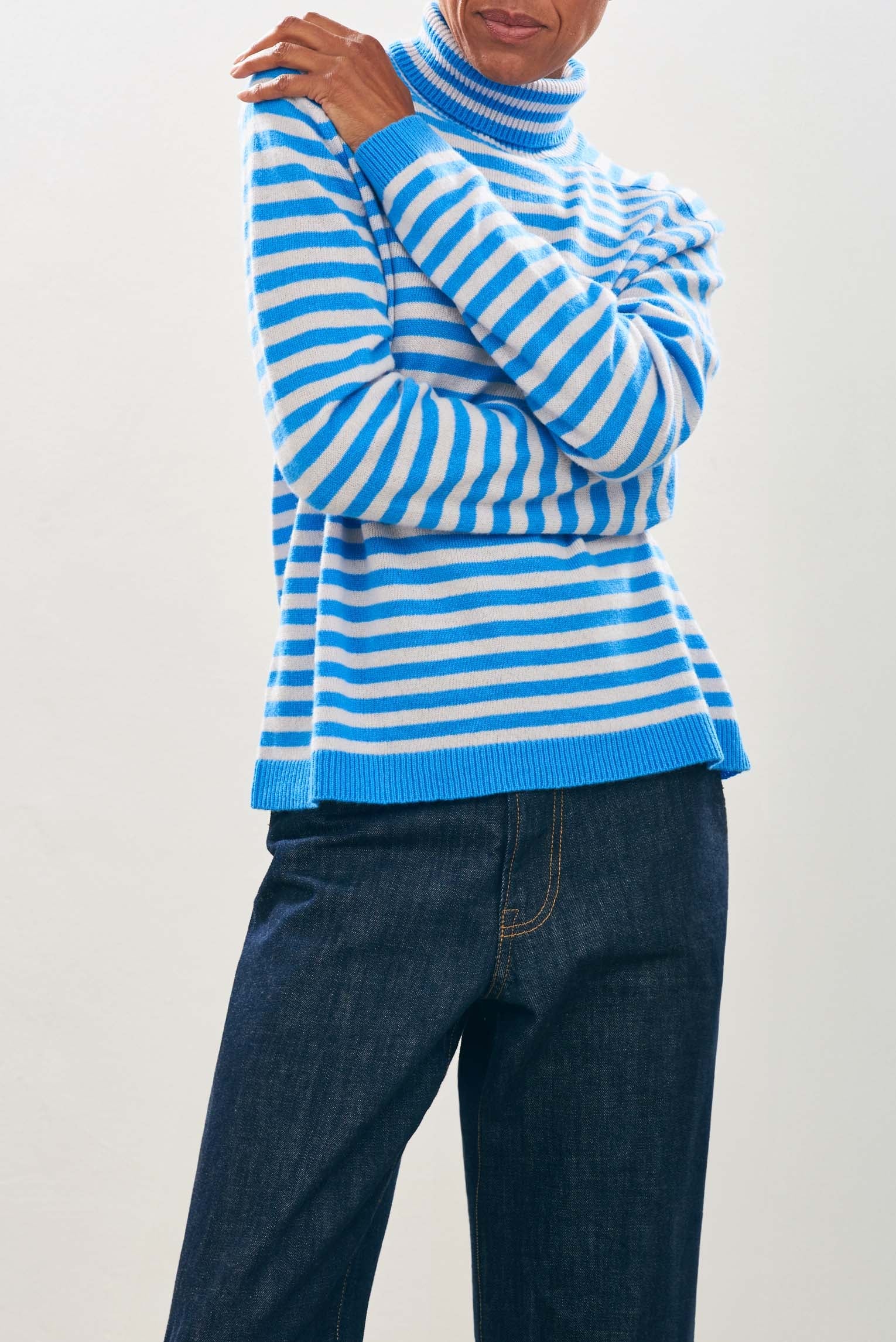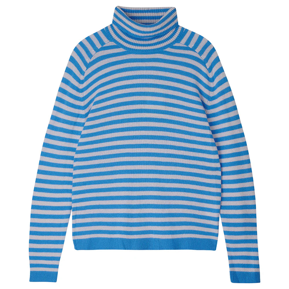 Jumper 1234 cashmere jumper. Sky and fog narrow stripe cashmere roll collar with saddle shoulders. Slightly oversized fit