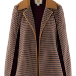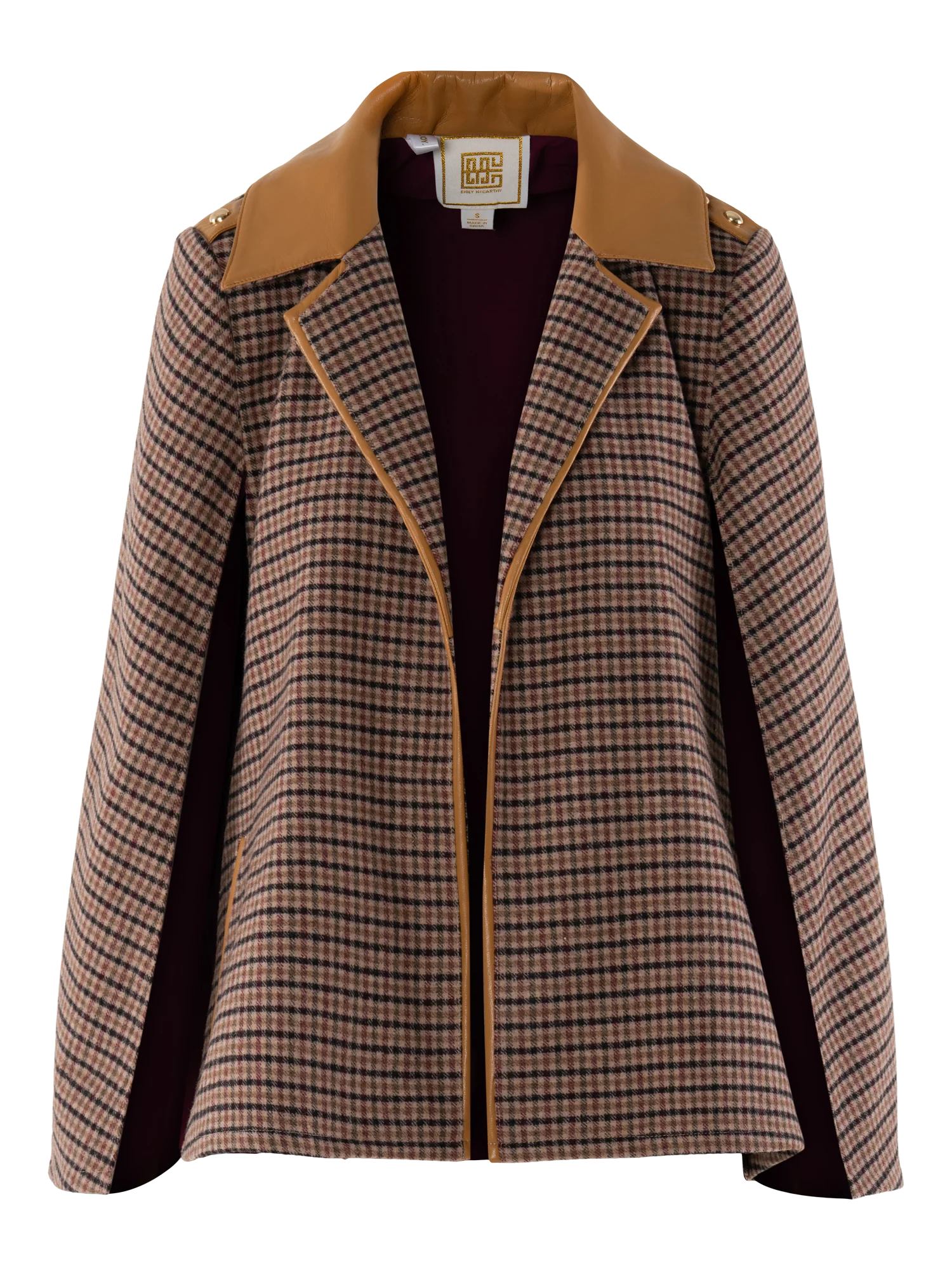 The Overlay Cape in Tweed is a statement layering piece designed with a classic lapel collar and cape-style sleeves that move gracefully to reveal the arms. Crafted from timeless wool tweed, this style is both cozy and refined, accented with vegan leather trim at the collar and edges for a modern finish. Gold stud details at the shoulders add subtle shine, while the deep burgundy lining offers a rich contrast. Pair it back with the matching Addison Jogger, or wear it as a standalone hero piece—this cape redefines outerwear with a touch of western-inspired flair.