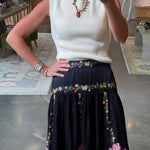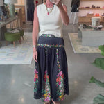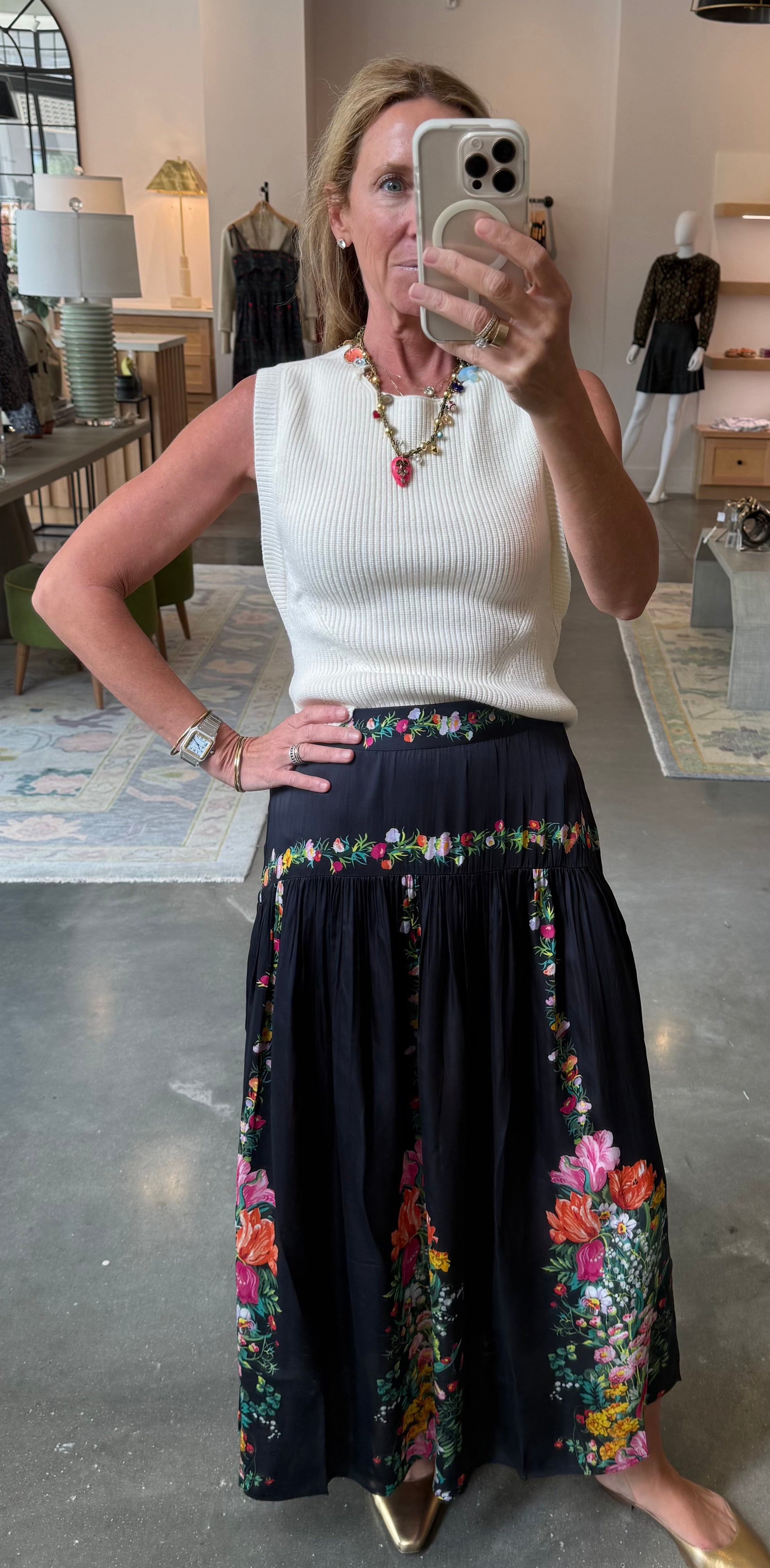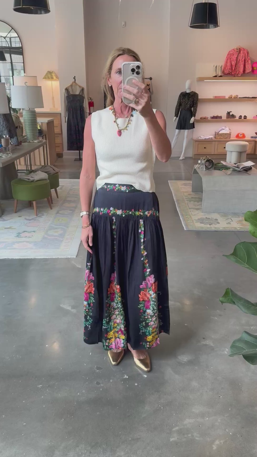 You know & love her! Phoebe is a classic EJ skirt style, known for her flattering drop waist silhouette. This season, Phoebe is cut from our Centerpiece print, with pops of color on a black satin fabric.