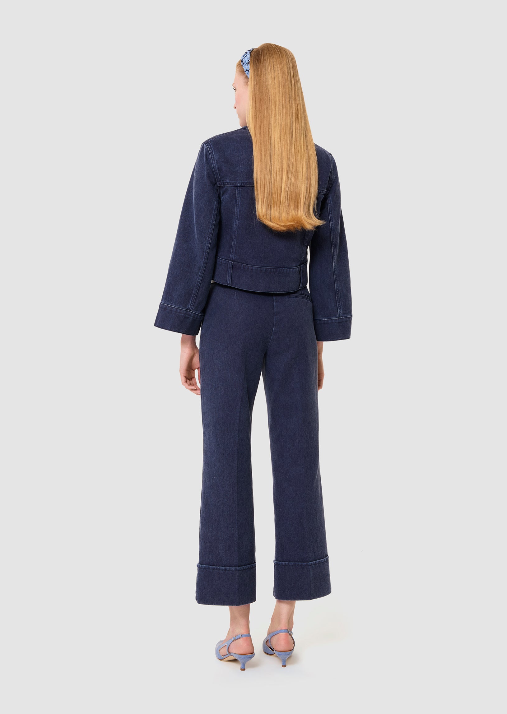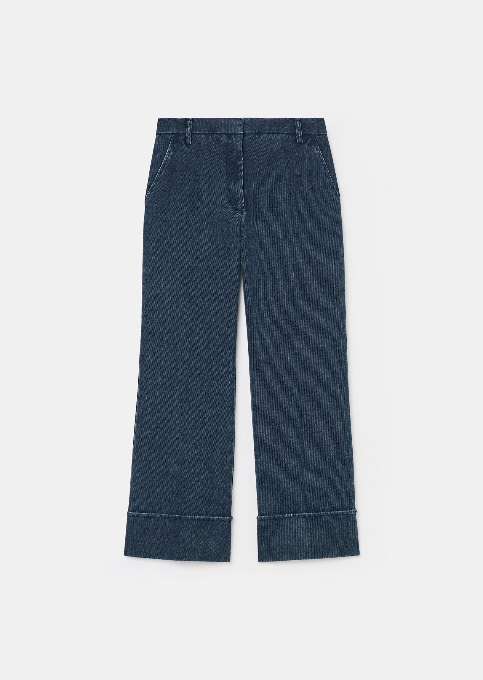 These indigo blue denim trousers have a high waist, a 7/8th cut and a shortened straight leg with wide lapels at the bottom. They have belt loops, Italian pockets and welt pockets on the back. Classic zip, button and clip fastening.