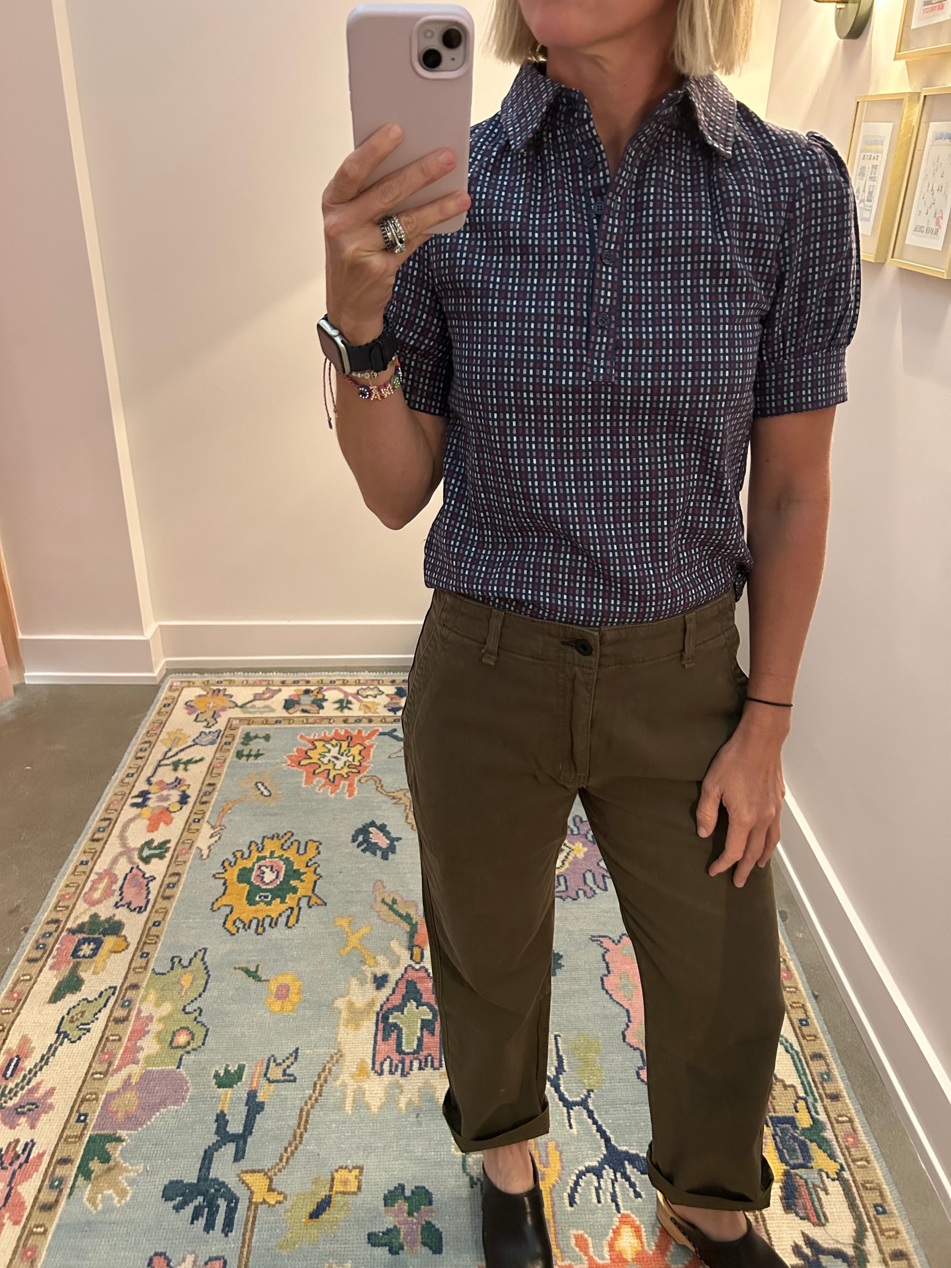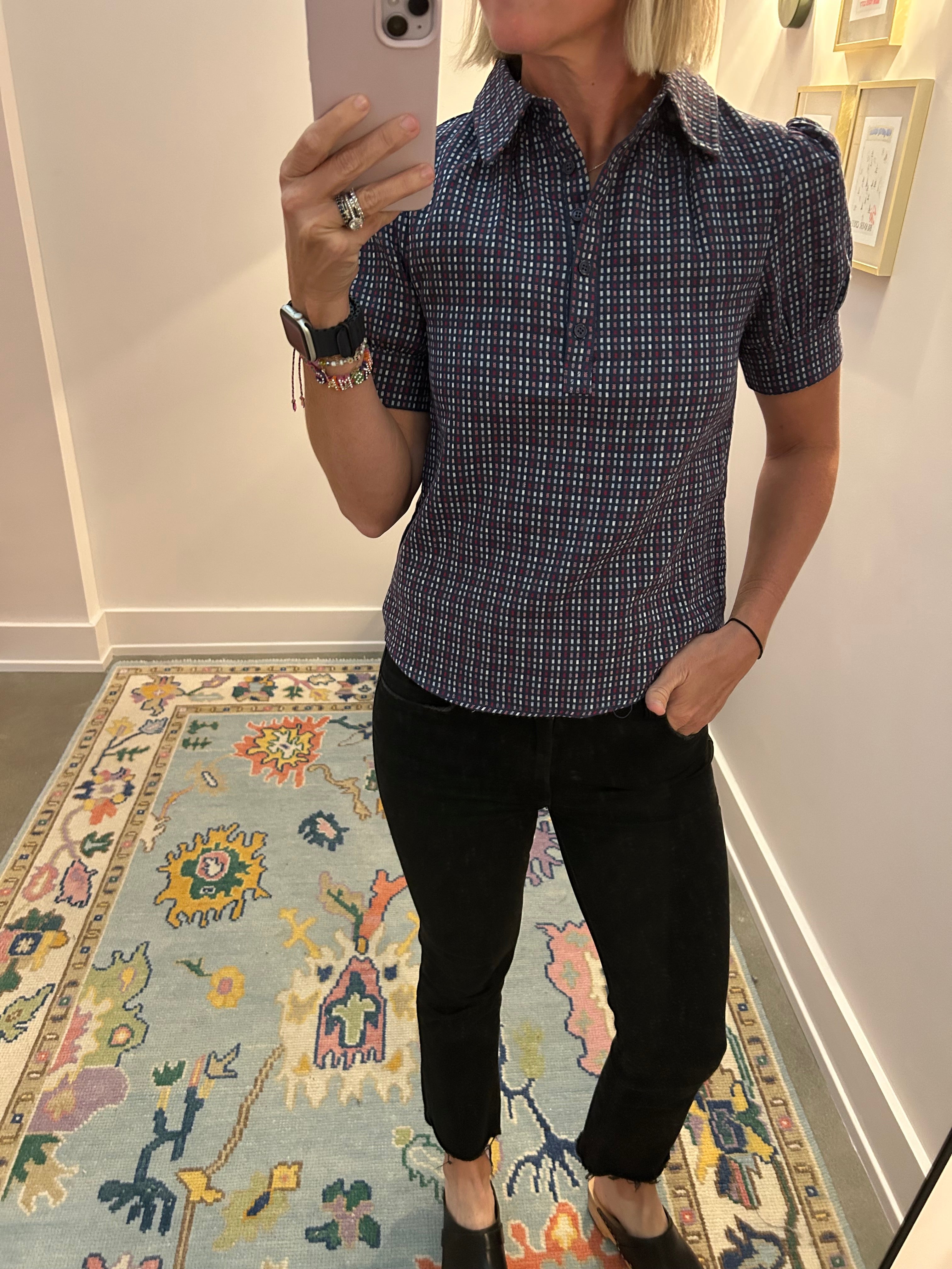 This blouse is the perfect mix of classic and playful. The subtle multicolor checkered print adds a bit of personality, while the soft, lightweight fabric makes it an easy choice for all-day wear. The puffed sleeves and cuffed detail bring just the right amount of structure, making it feel polished but never fussy. The Preston Top is the piece you carry with you from season to season.
