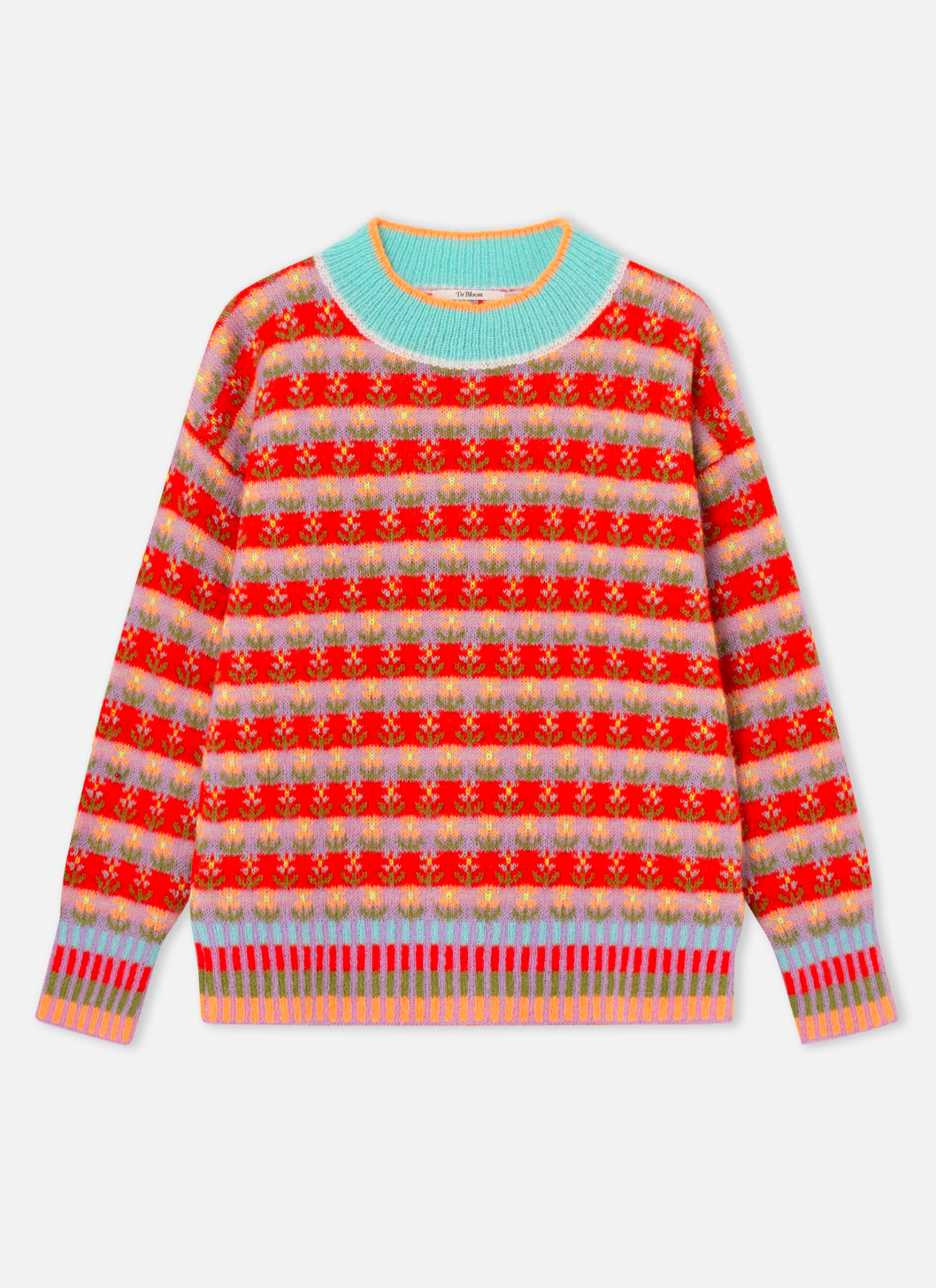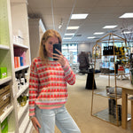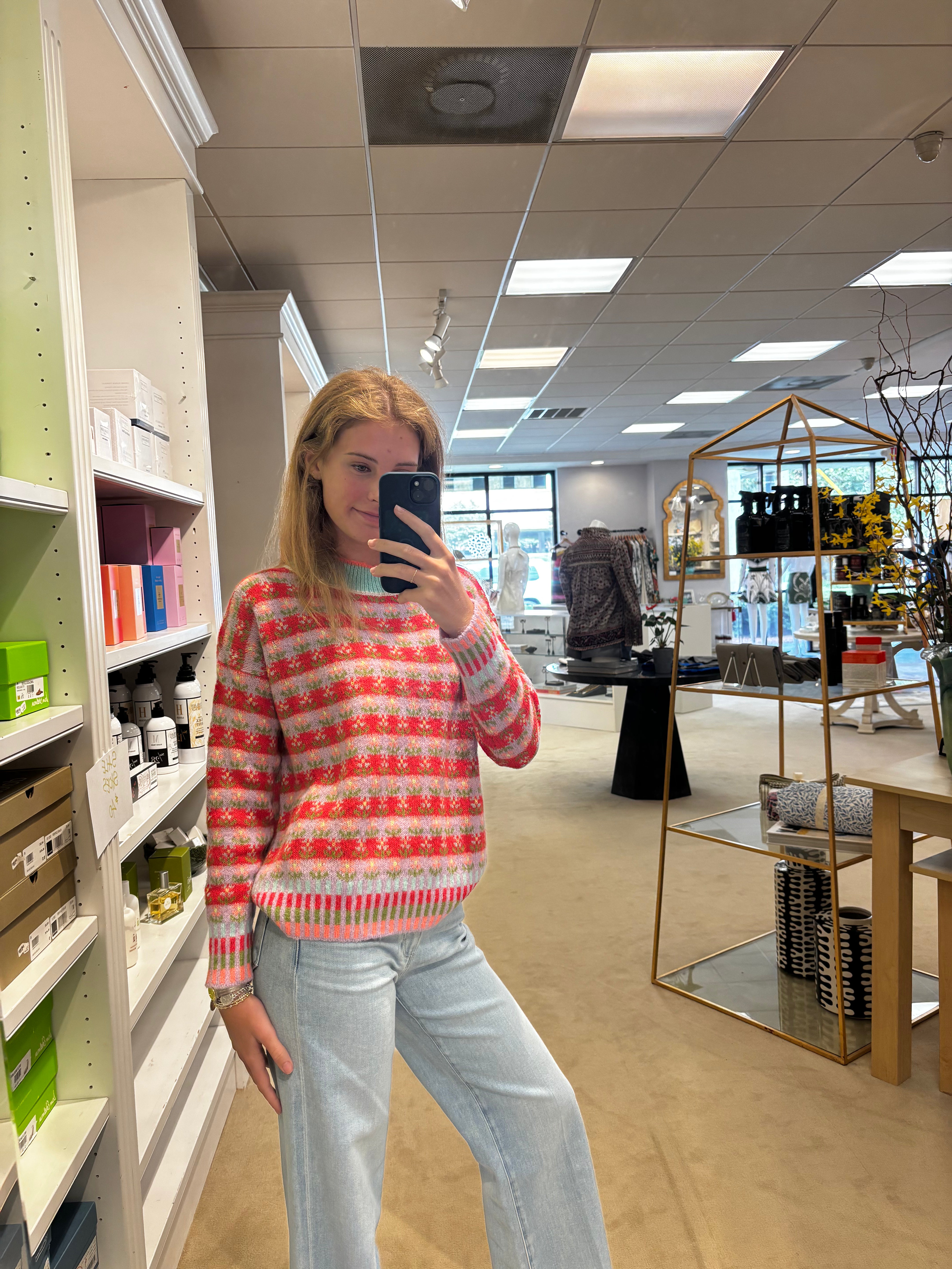 Red, teal and lilac sweater in a fun, floral striped print! Great paired with denim or a maxi skirt.