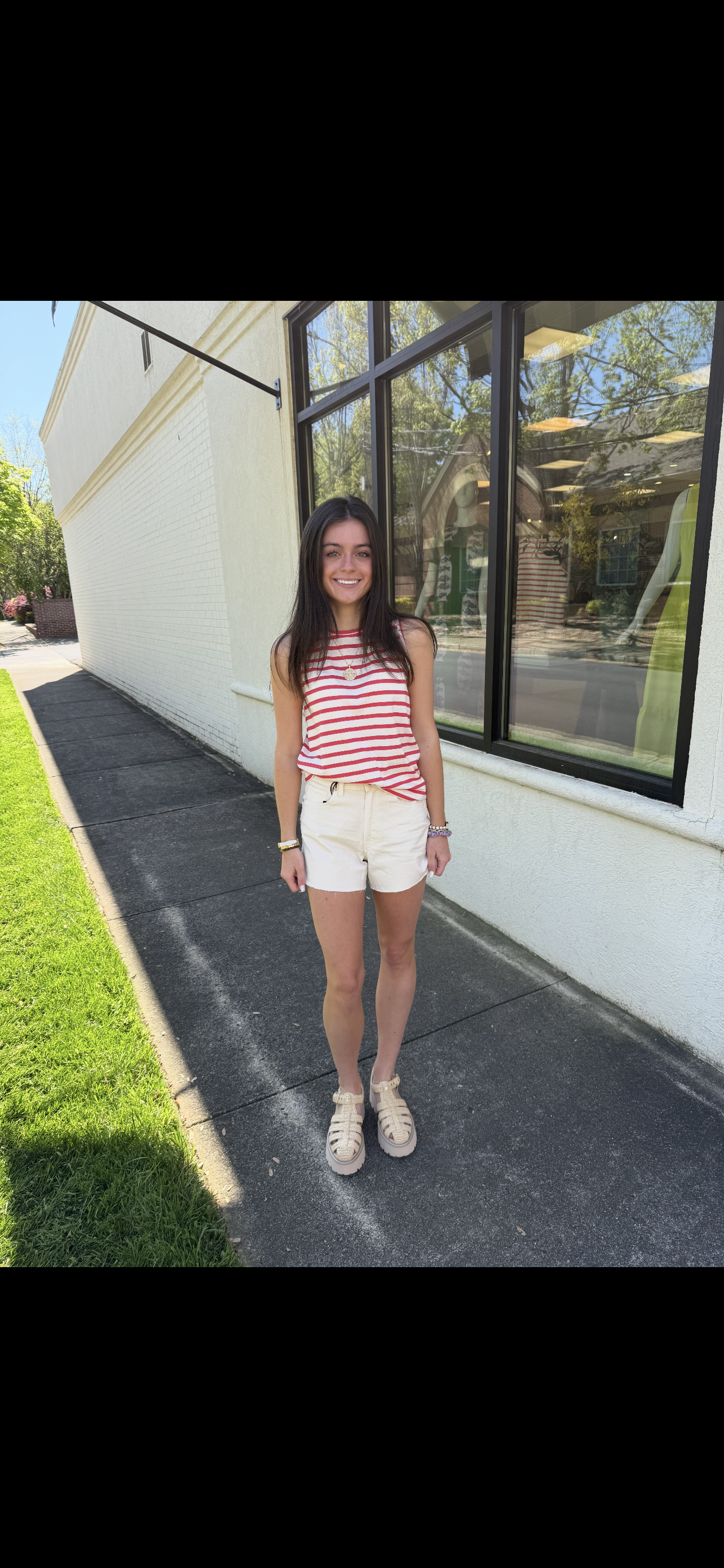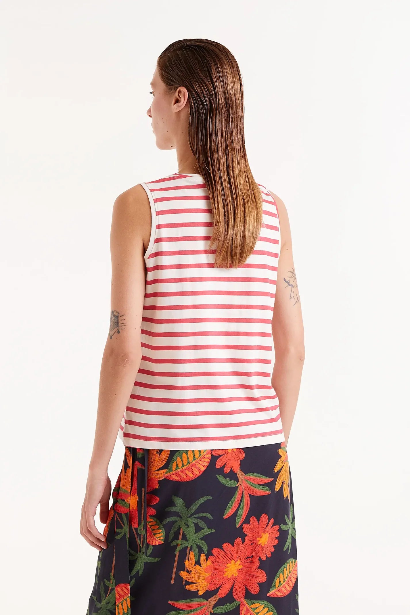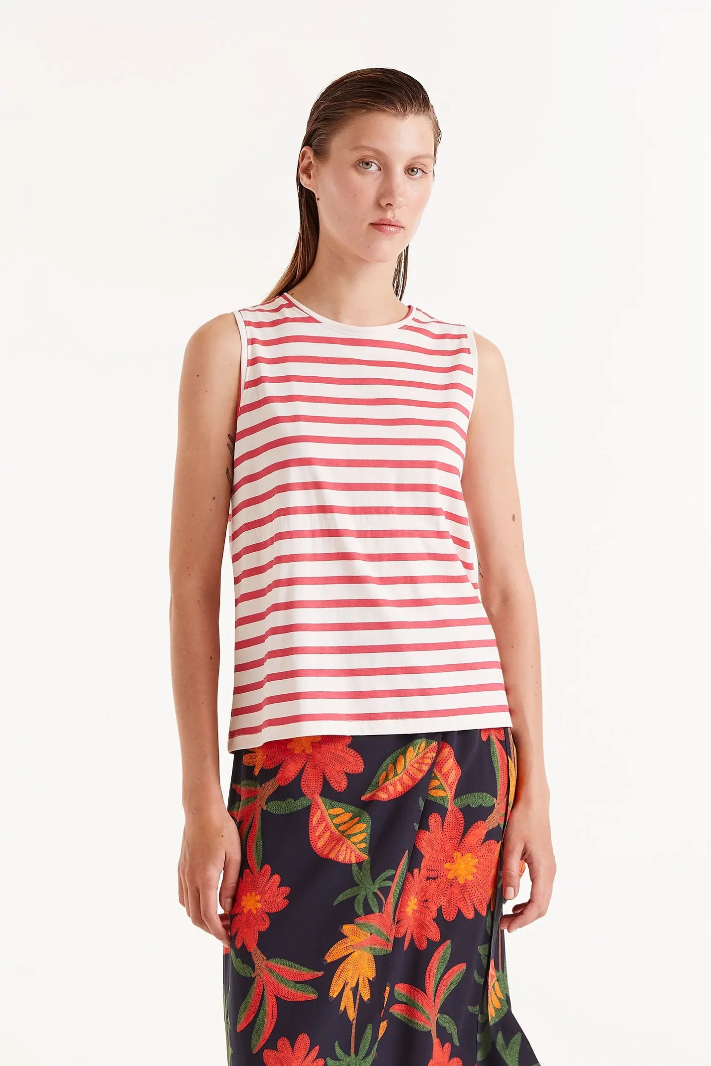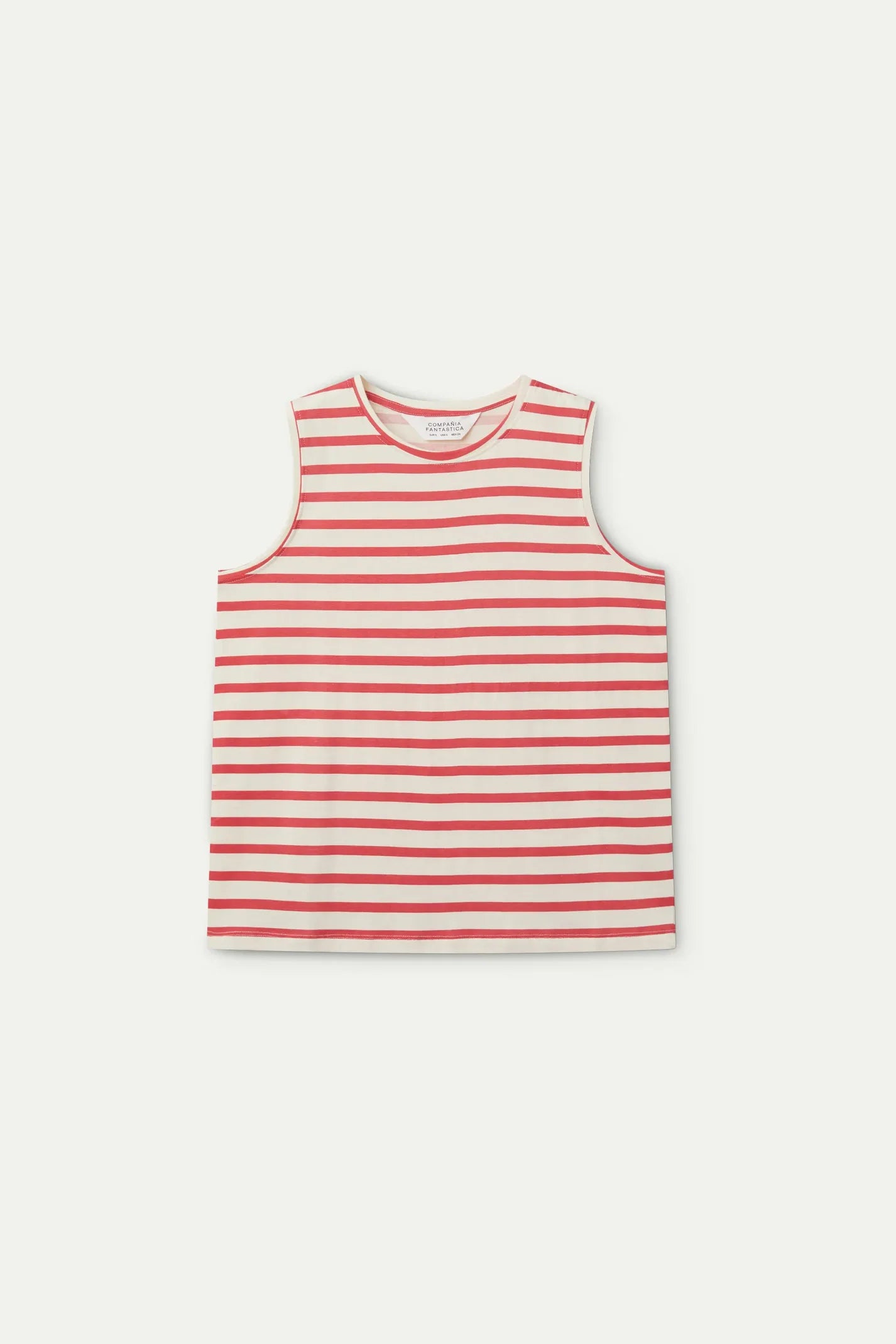 Circular knit T-shirt with a red striped print. Round neck and sleeveless.