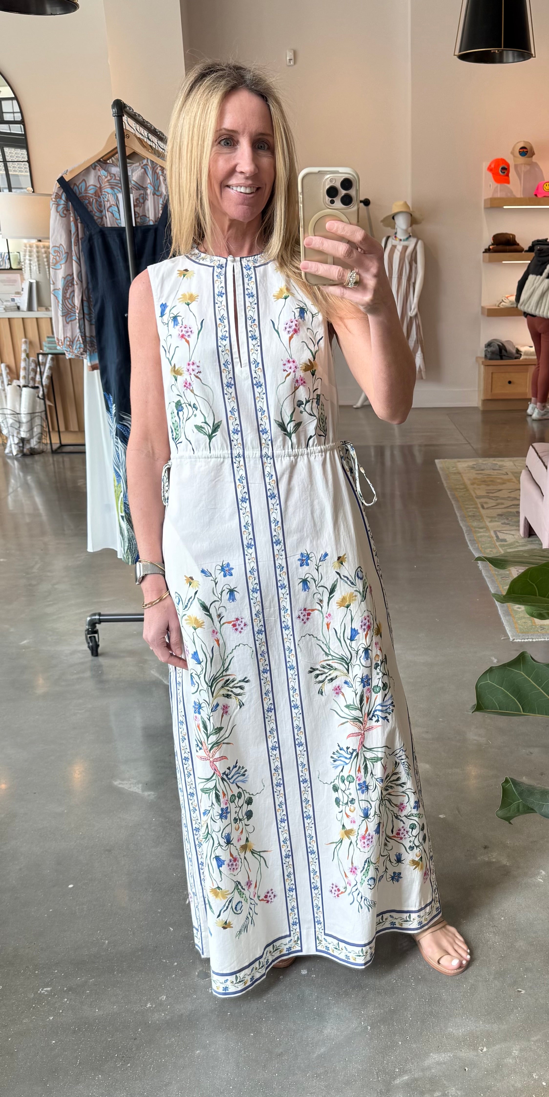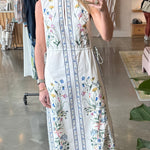 Our number one best-seller of this collection, the Rhonda is a sleek, modern column dress. Drawstrings at the sides make the dress easily customizable, with gold cap details. A fabric-covered button at the front of the crewneck creates an elevated keyhole detail. Elements from our Tidepool print — wildflowers, seaweed, and shells — climb up the front of the dress in undulating abundance, with a delicate border detail framing the front and sides. Finished with side-seam pockets