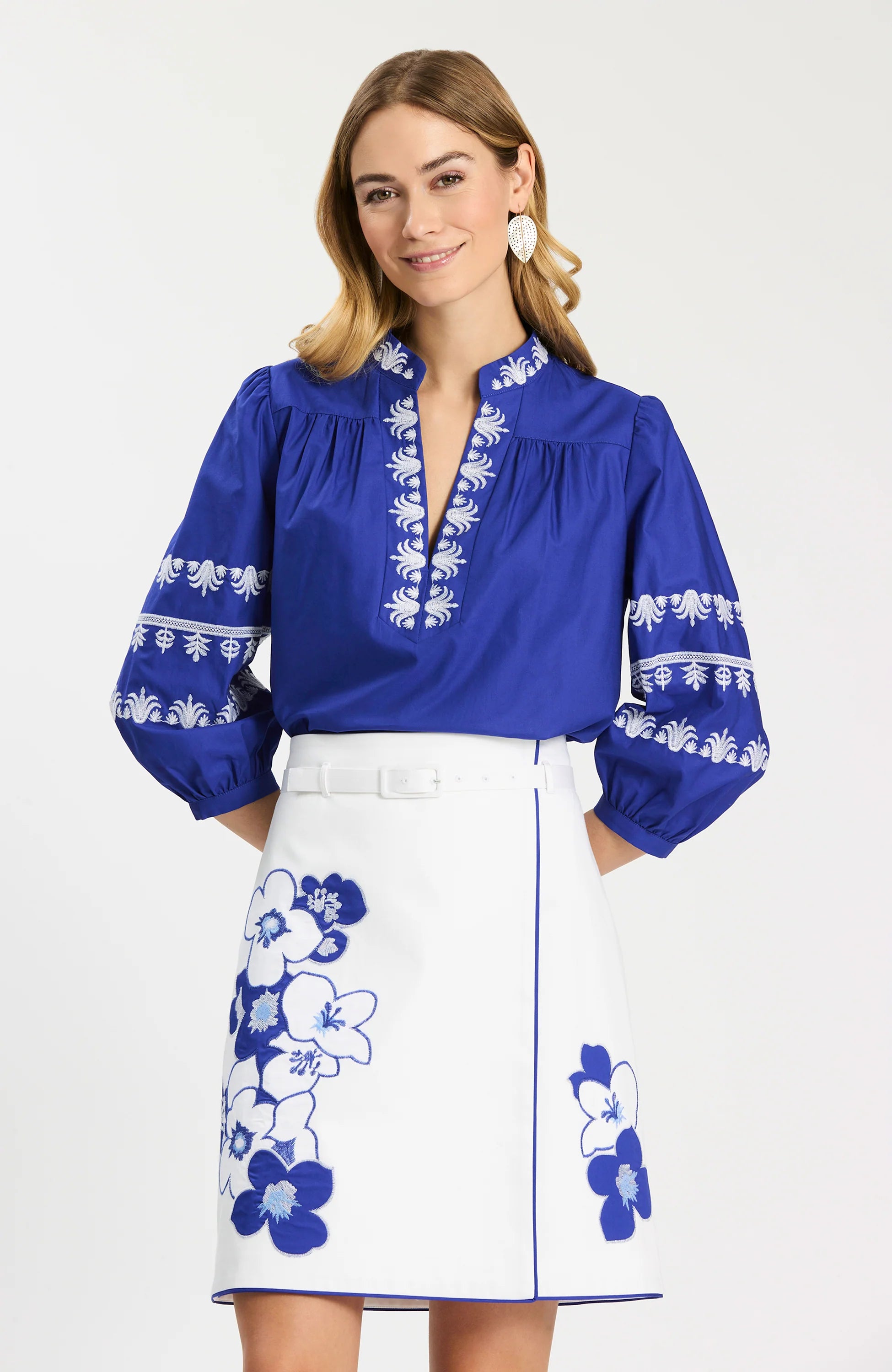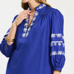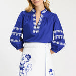 An elevated everyday blouse with beautiful detail. Designed in a rich blue hue, this top features delicate embroidered accents along the neckline and sleeves for a feminine, artisanal touch. The relaxed silhouette and softly gathered sleeves make it as comfortable as it is polished. We love to pair this with the Simone Skirt for a perfectly styled look.