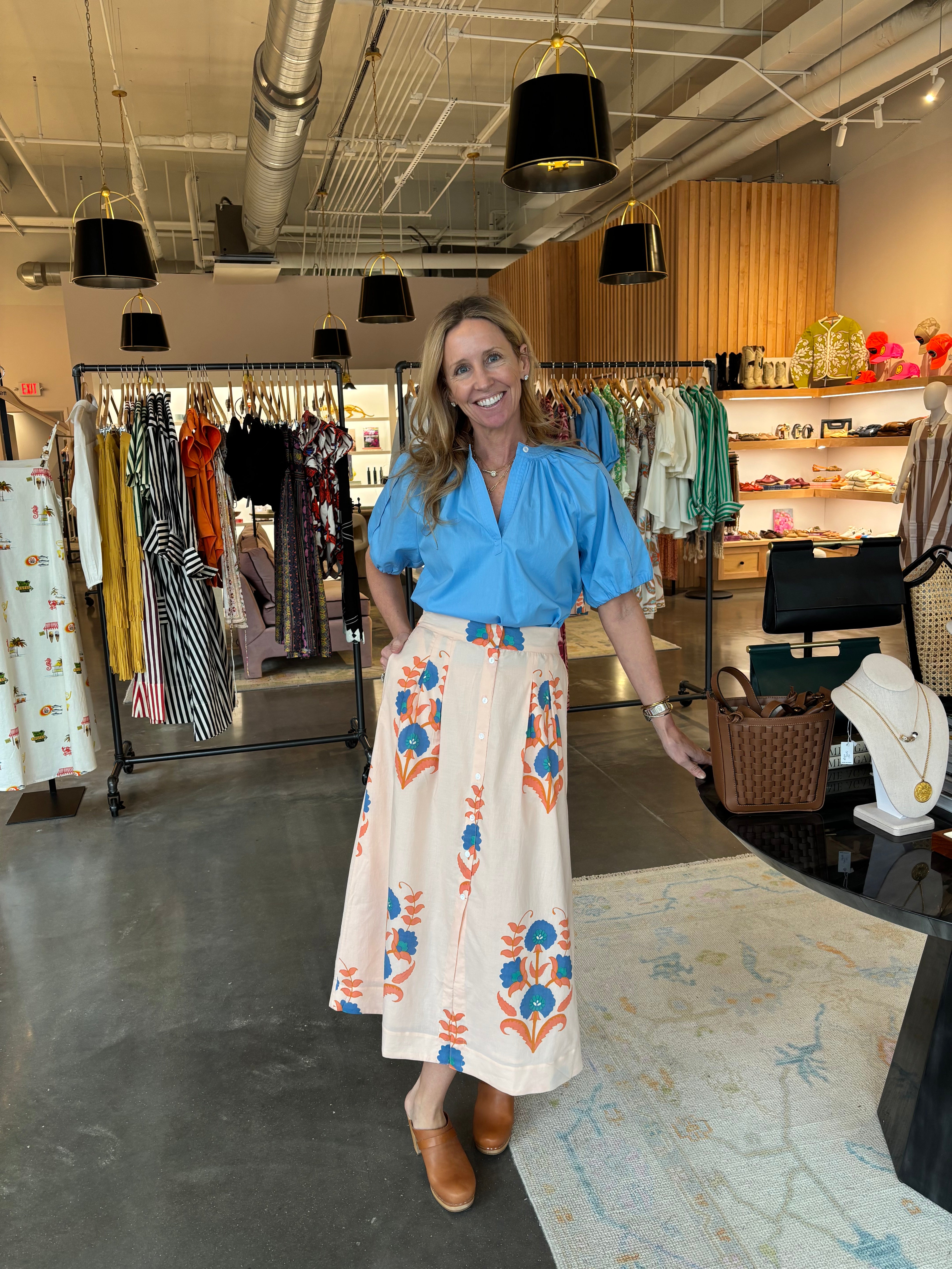 The Scout Skirt is a high-waisted, A-line silhouette with a flattering midi length. It features a button-front closure, wide waistband, and soft pleating for added volume and ease. Side pockets add a functional touch, making it as practical as it is polished.