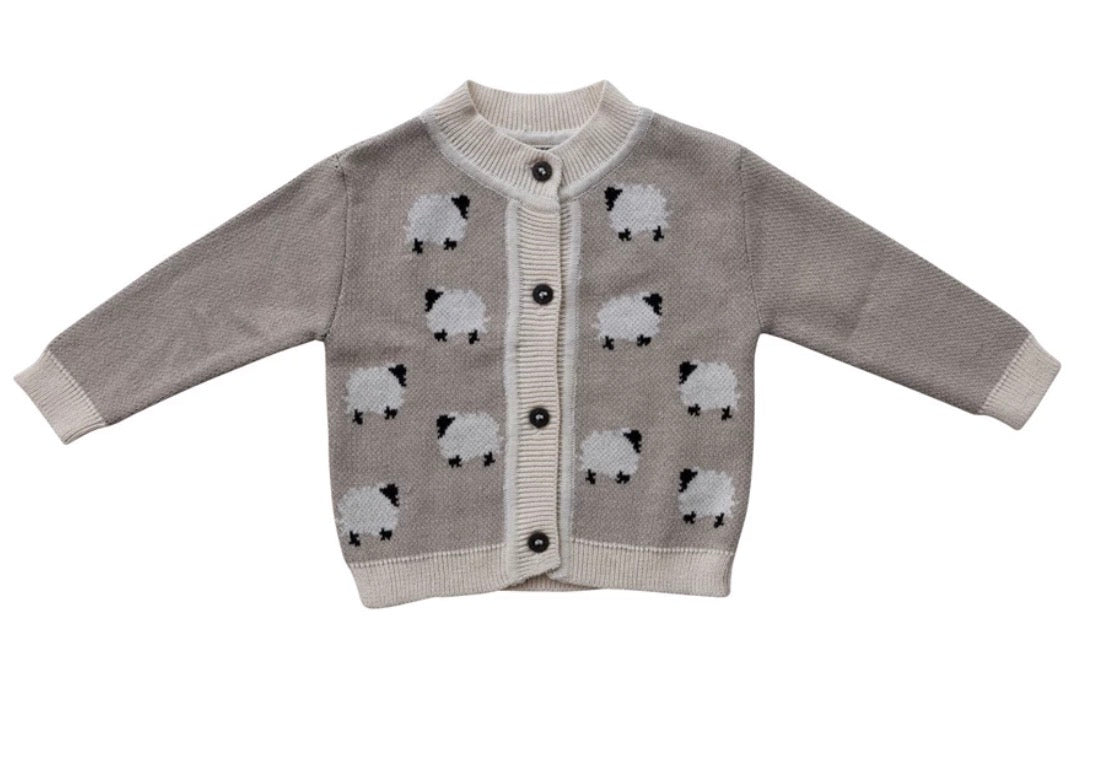 Cotton Knit Baby Cardigan Sweater w/ Wood Buttons & Sheep