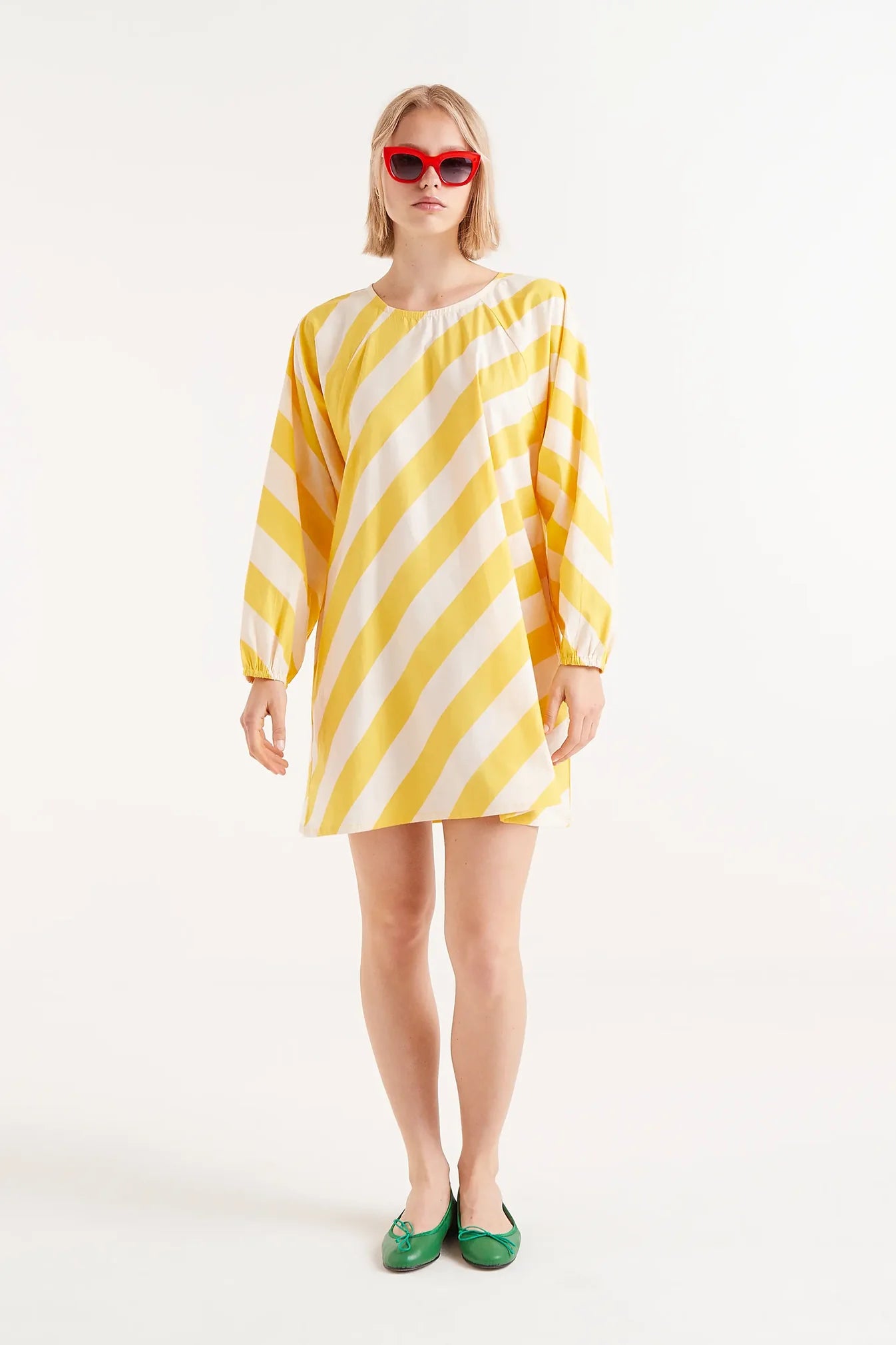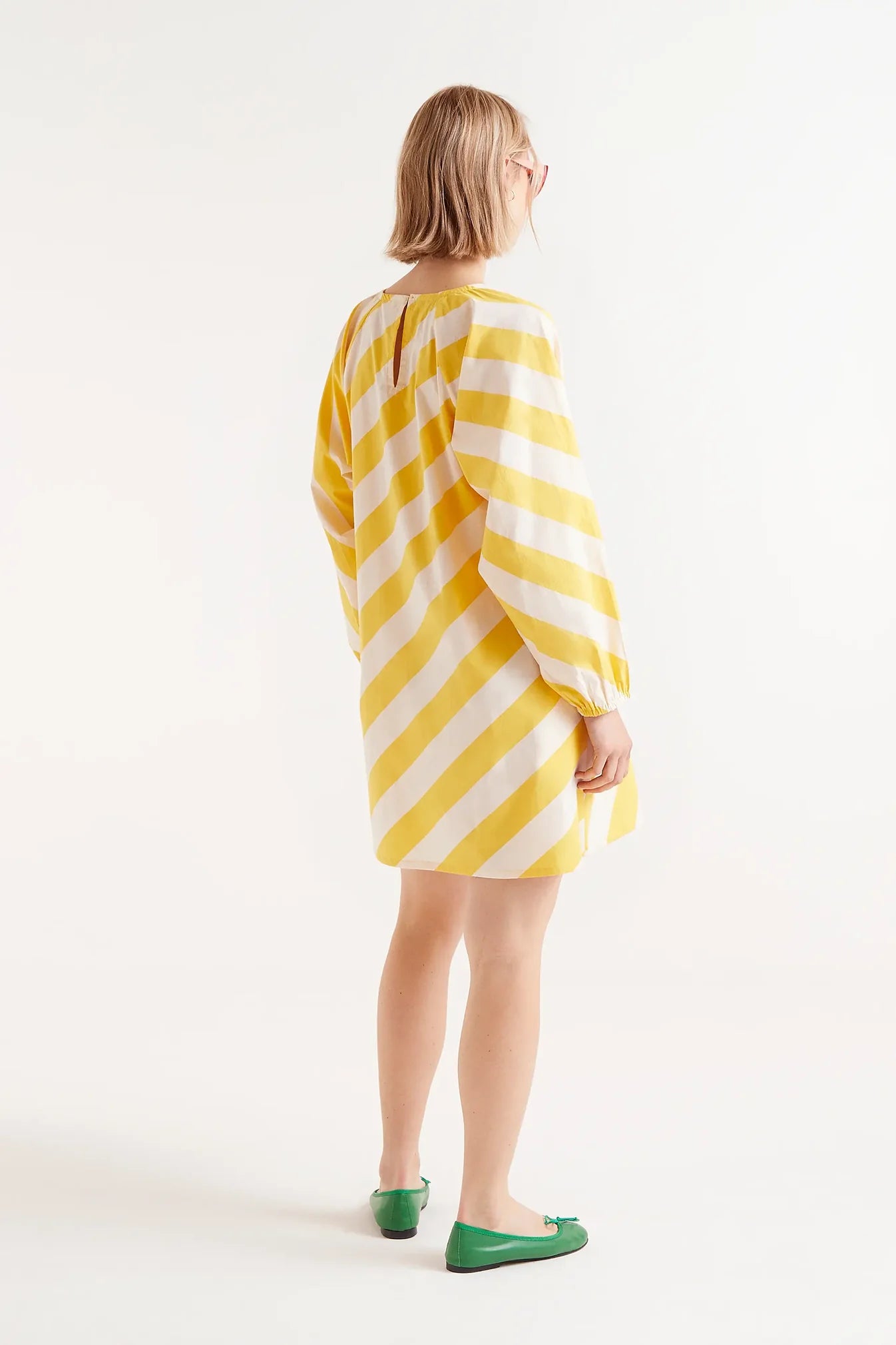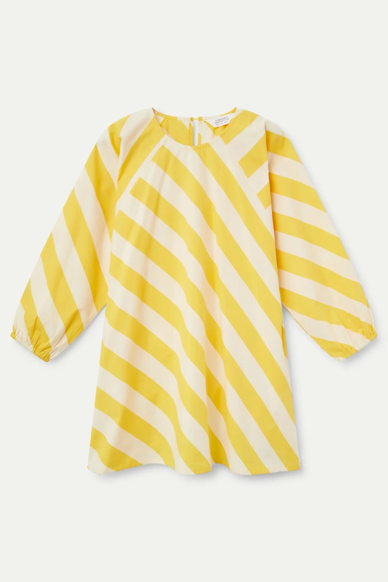 Short dress in cotton poplin with a yellow striped print. With a round neck and long puffed sleeves finished with elastic. Back closure with slit and button.